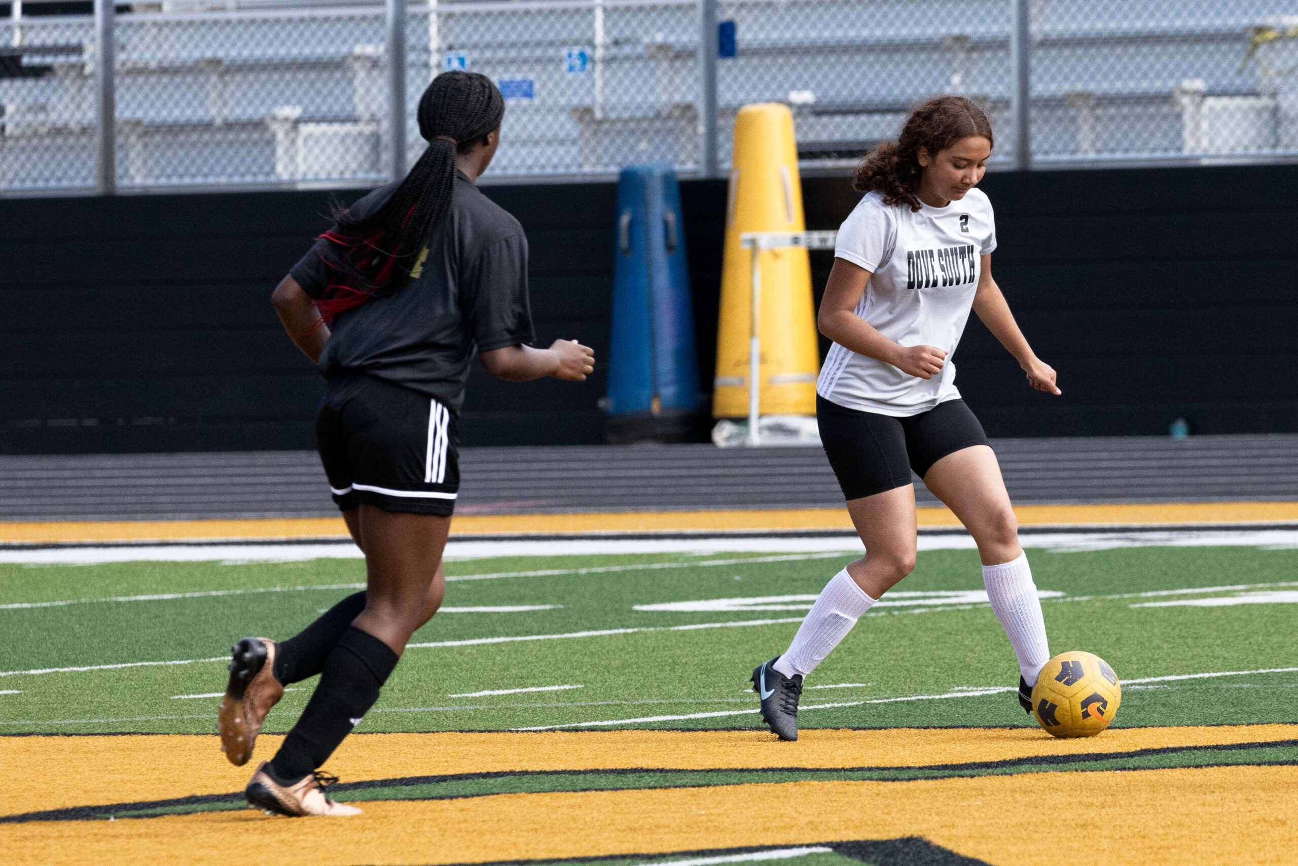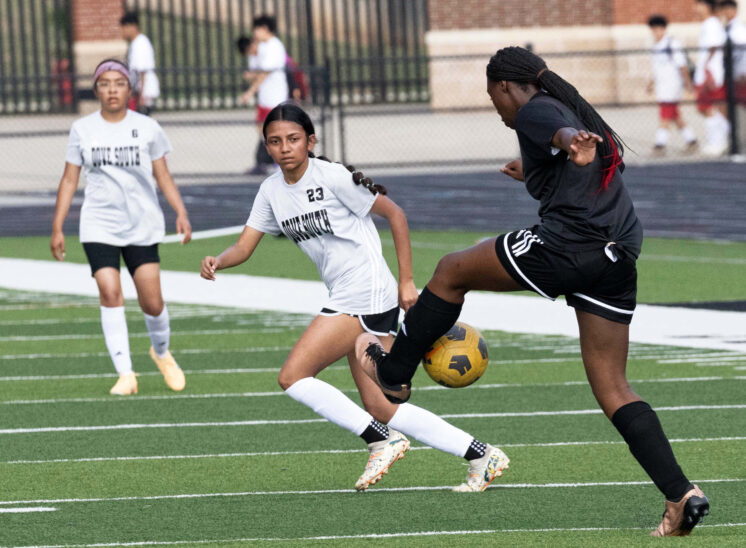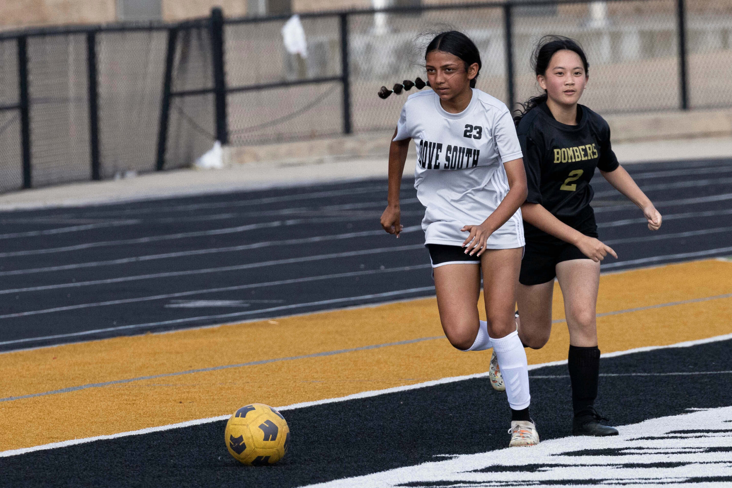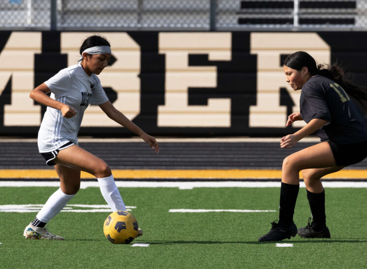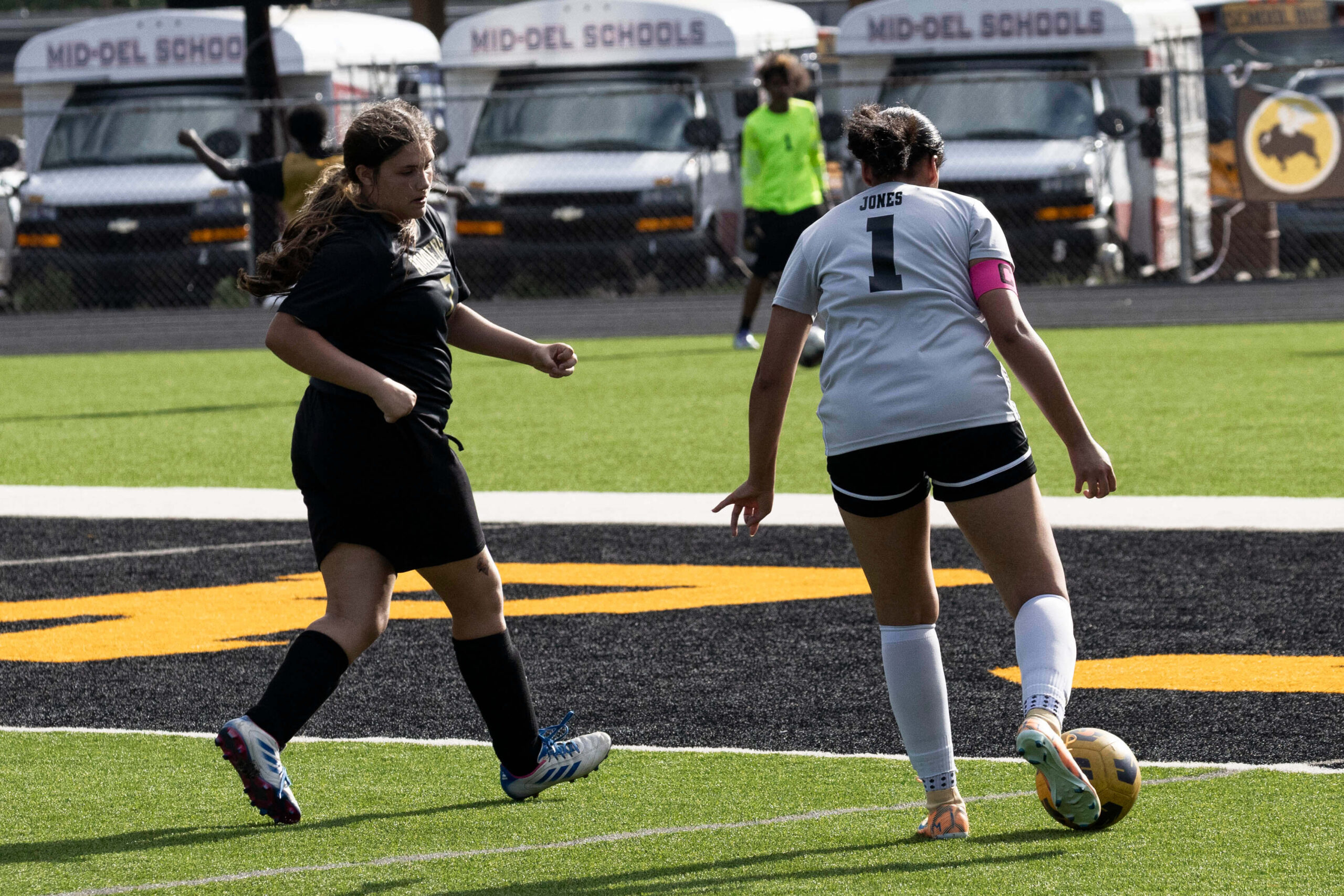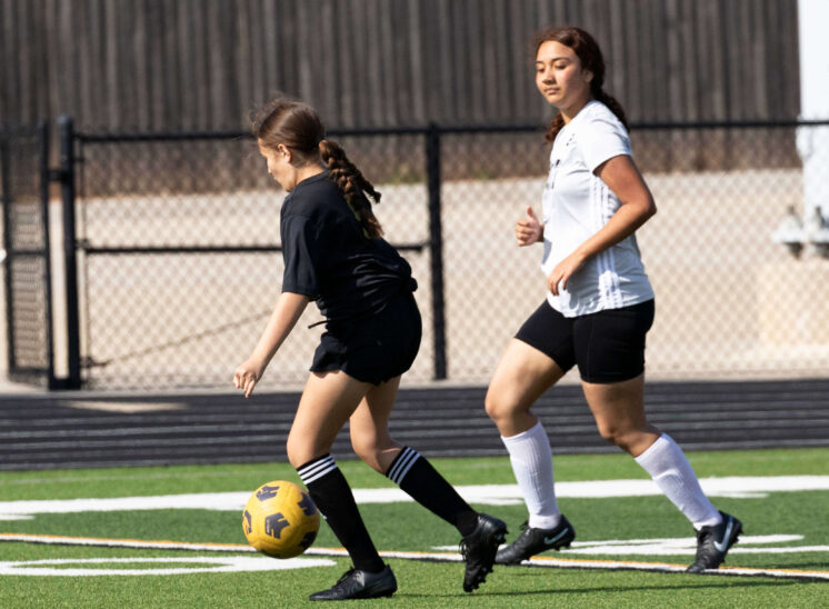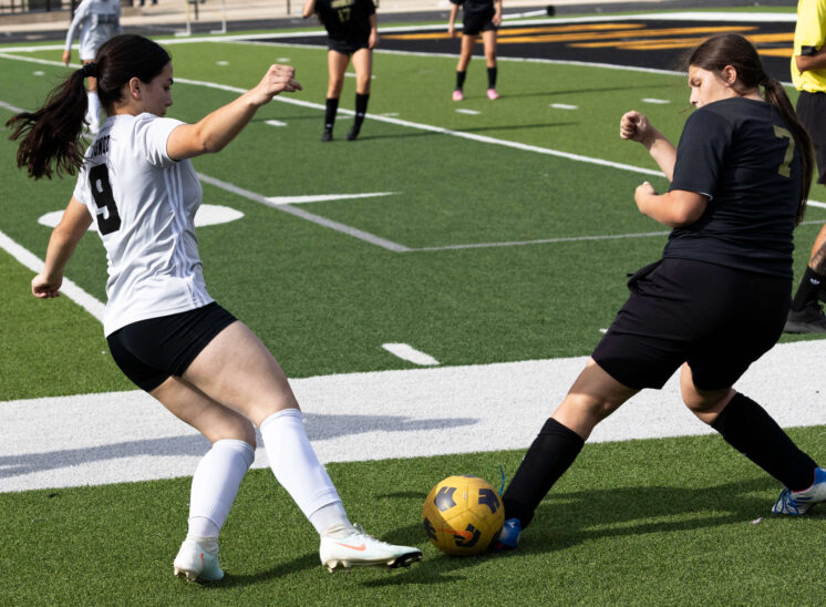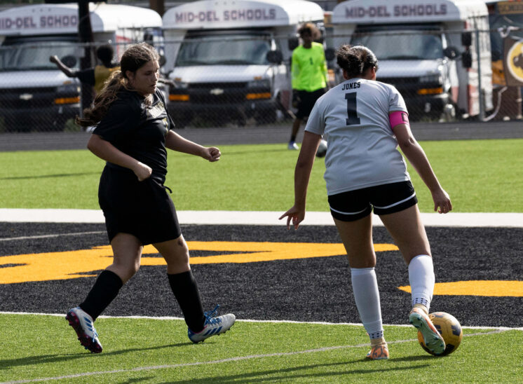 Midwest City middle school girls soccer player in black uniform dribbling the ball while being challenged by a defender