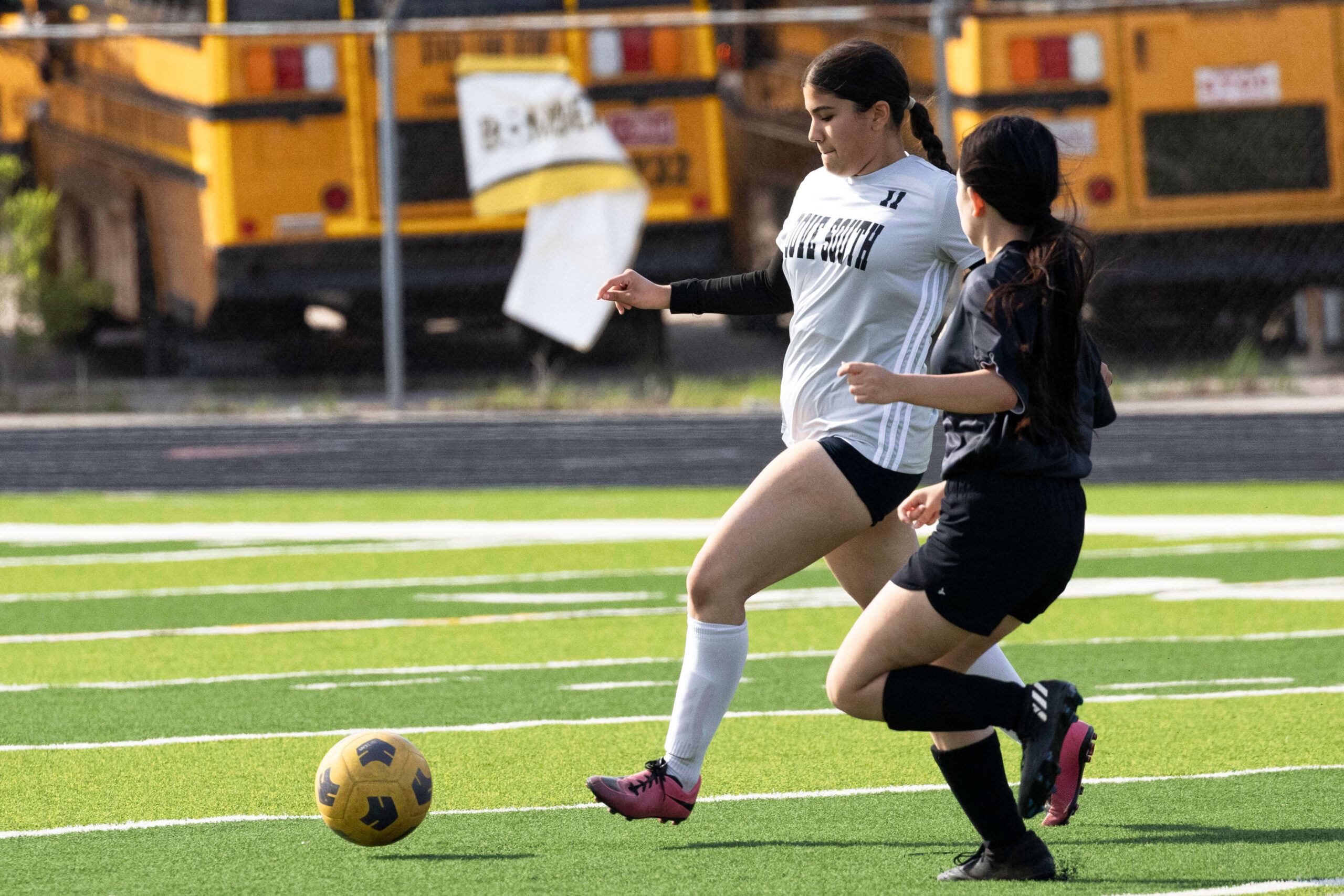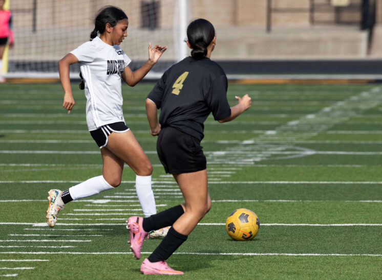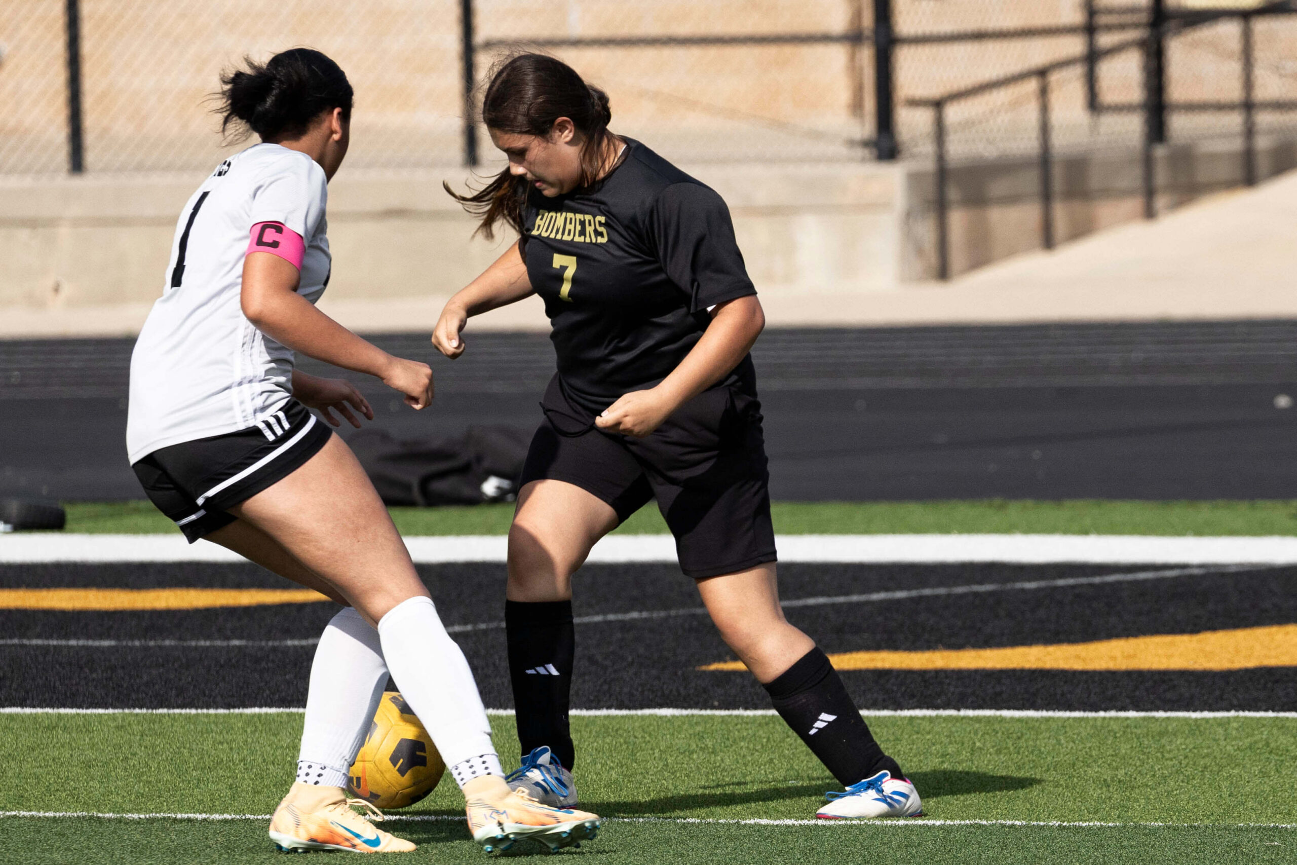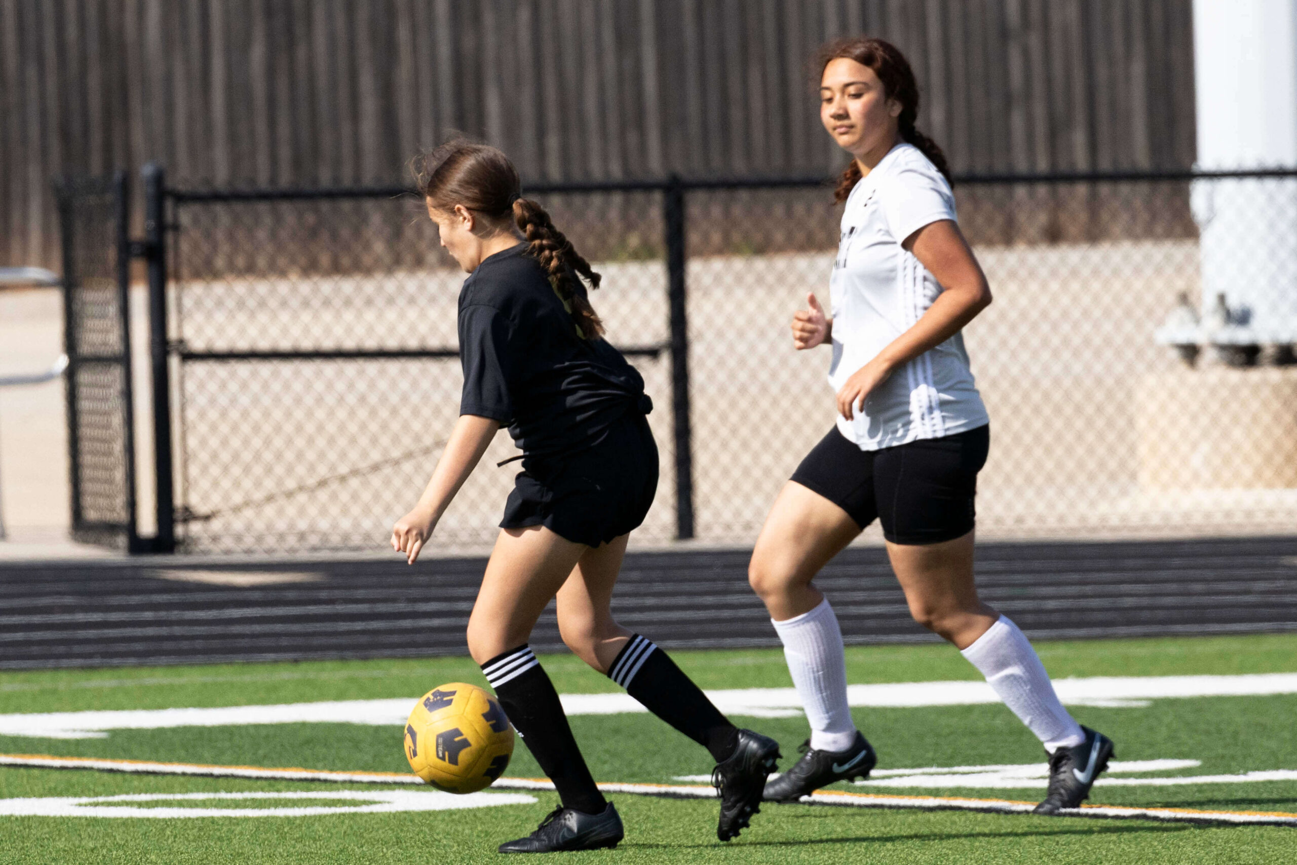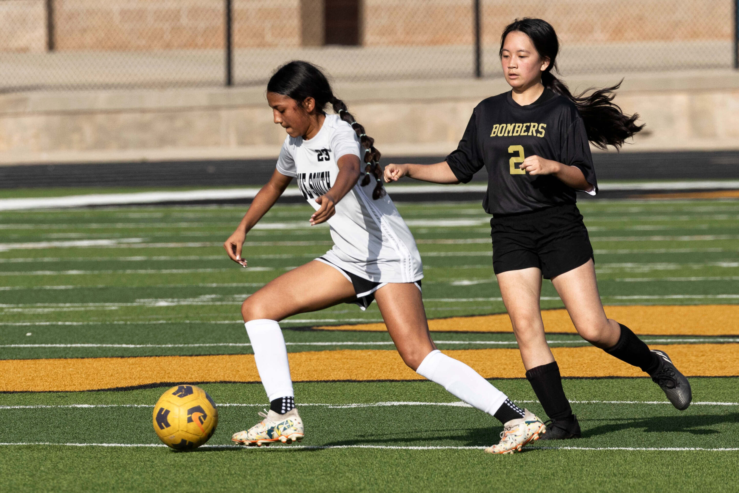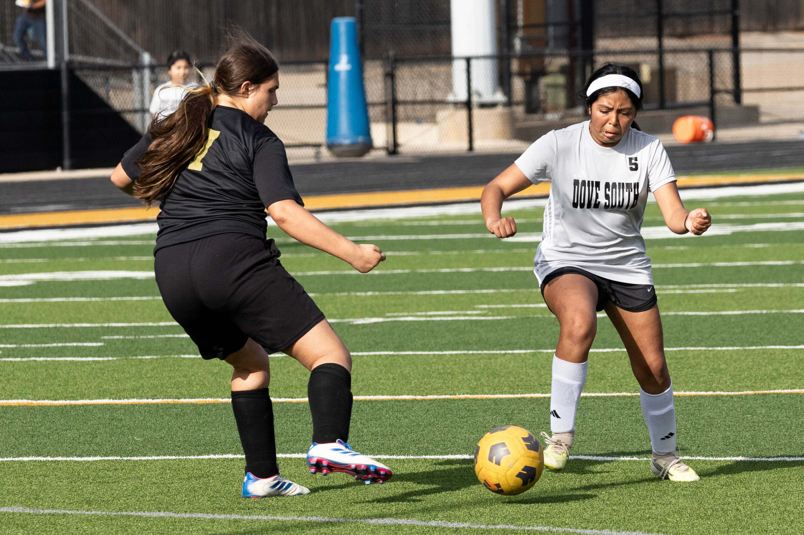 Midwest City middle school girls soccer player in black uniform dribbling the ball while being challenged by a defender