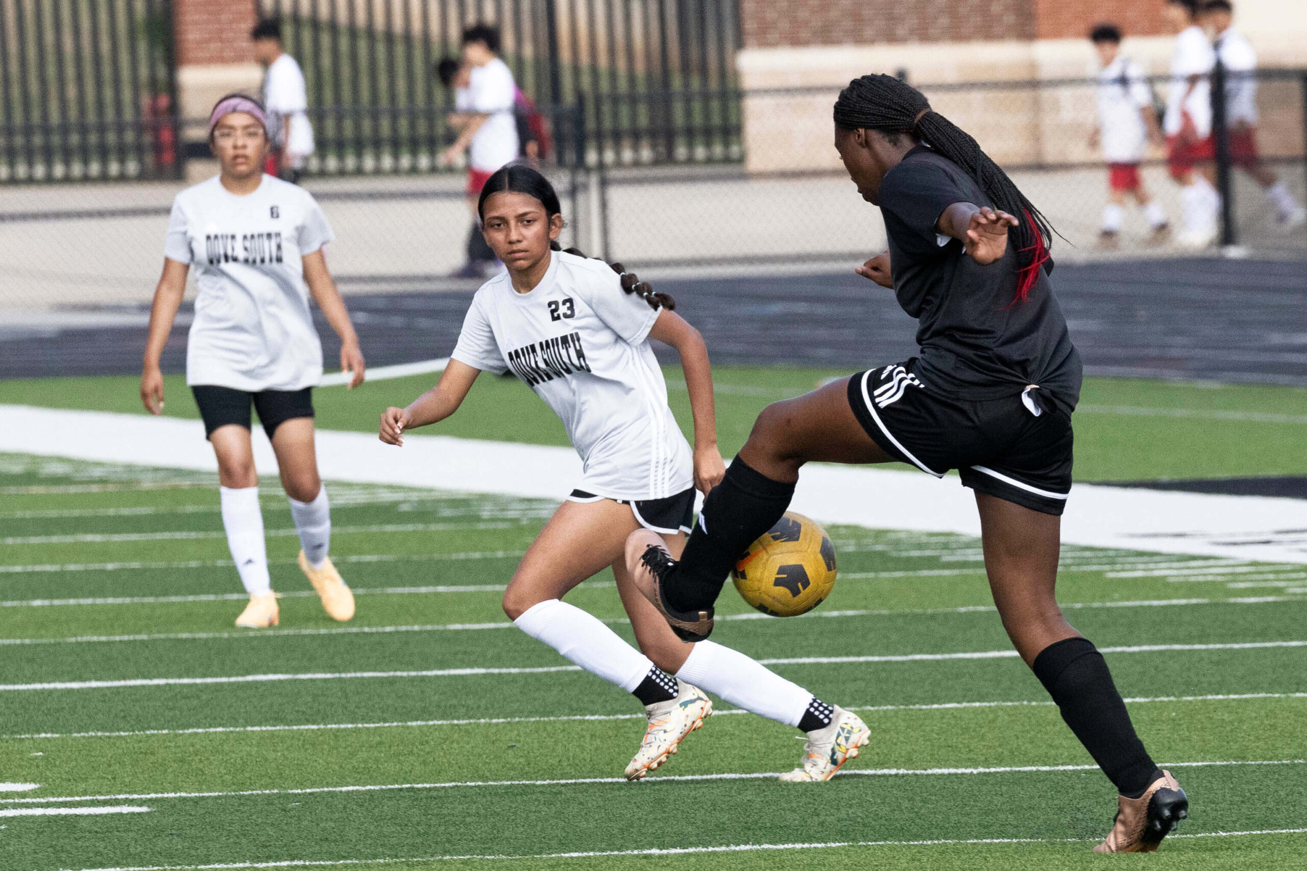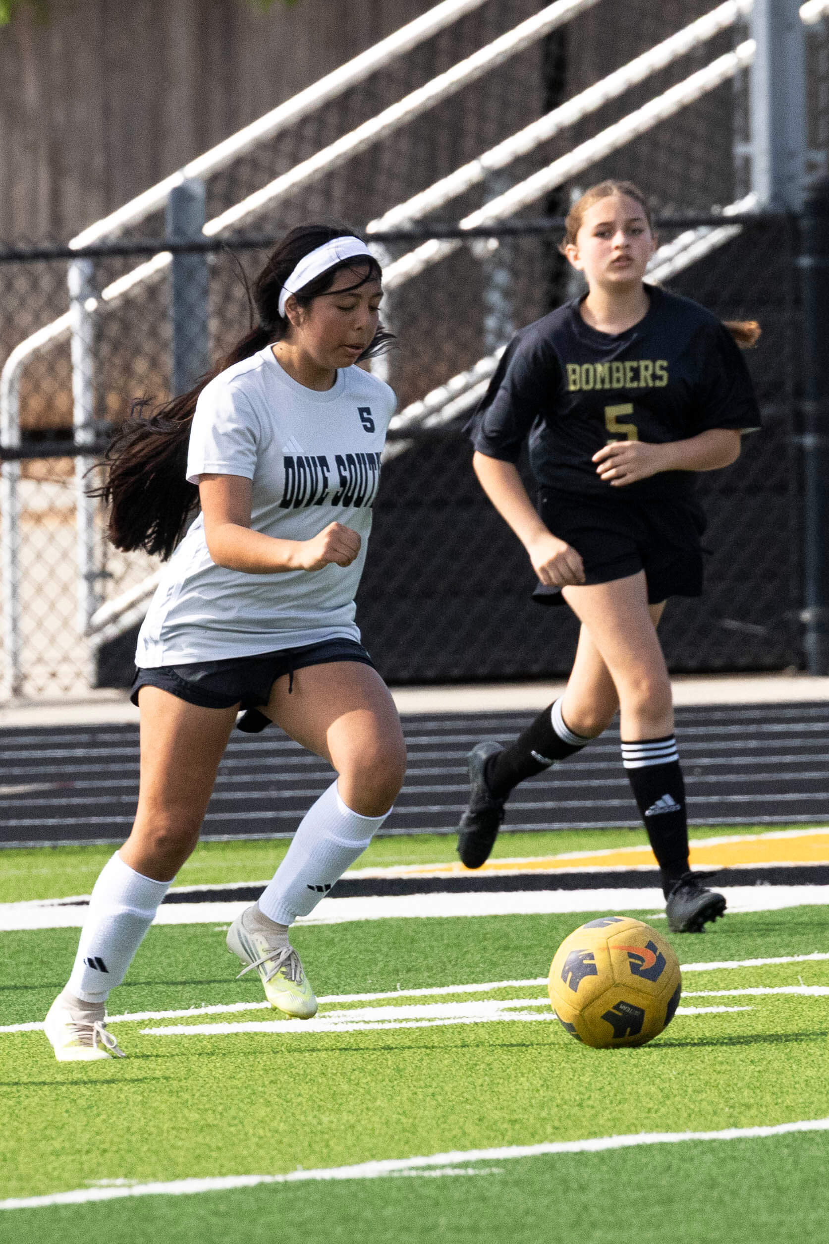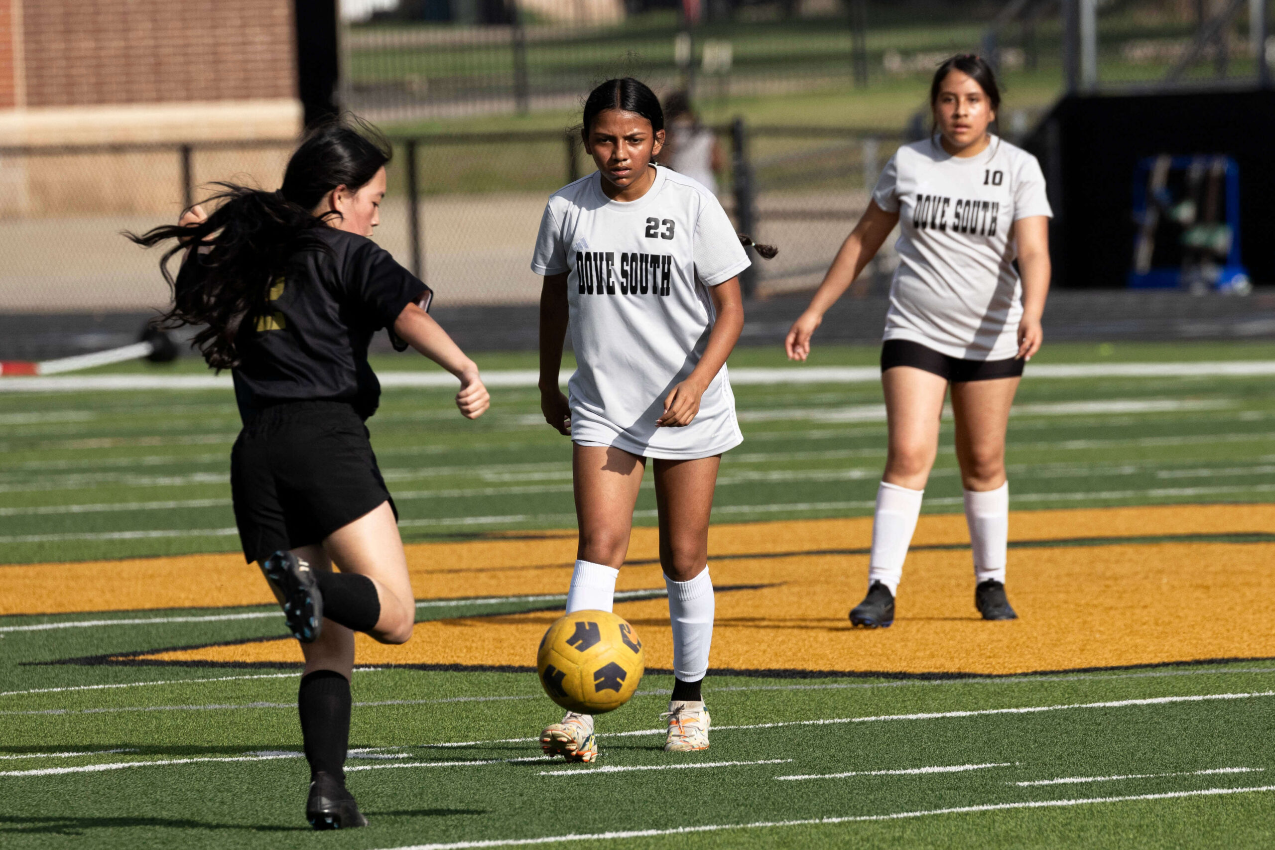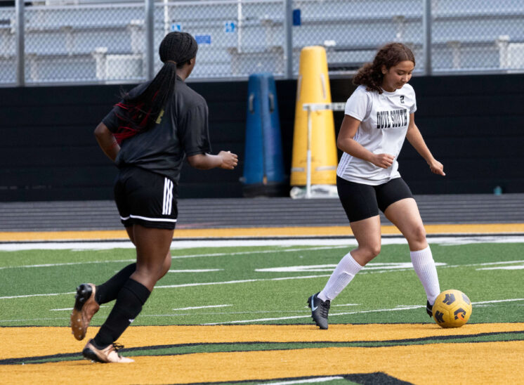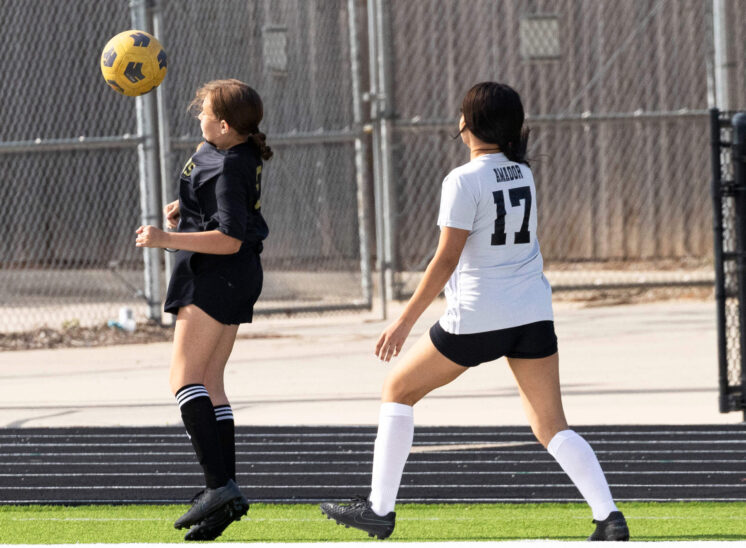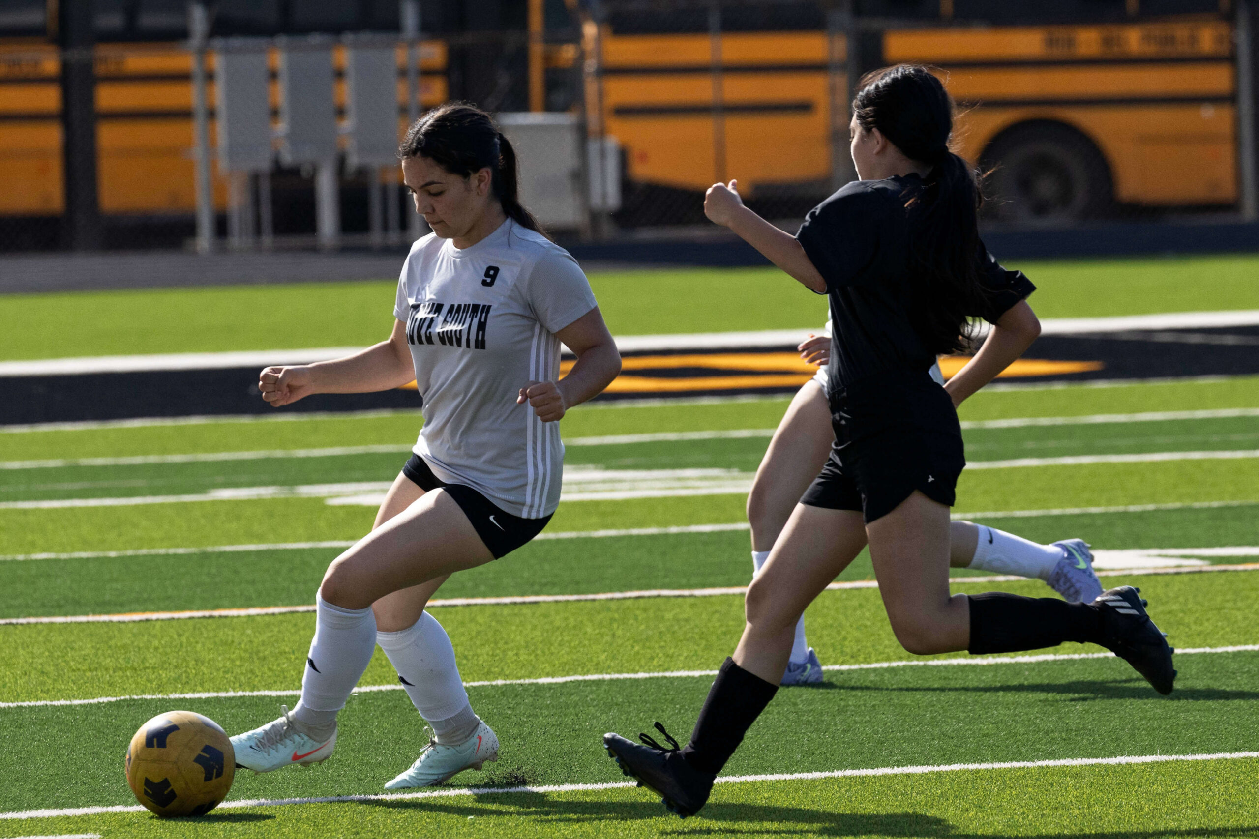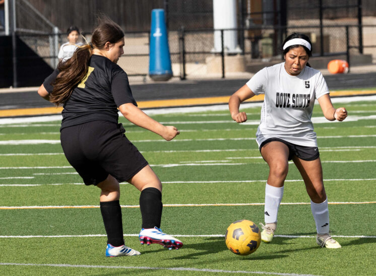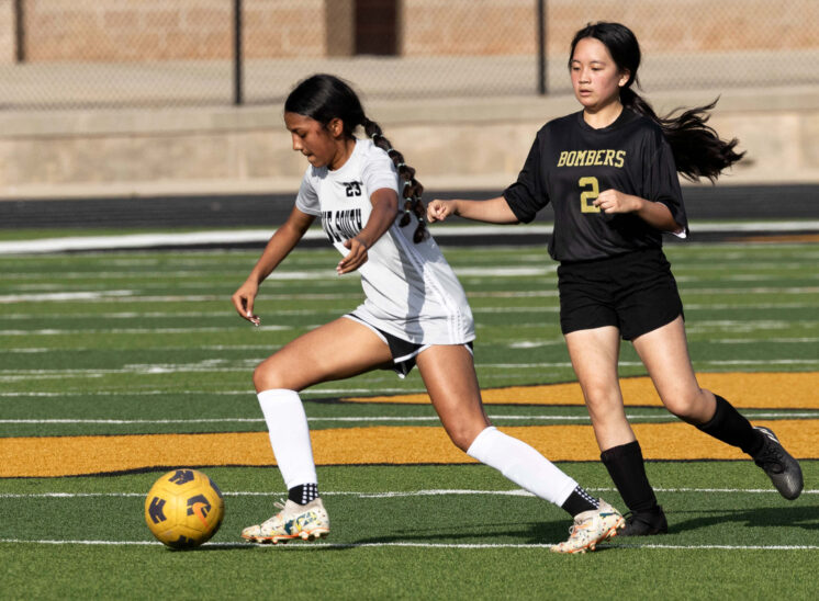 Midwest City middle school girls soccer player in black uniform dribbling the ball while being challenged by a defender