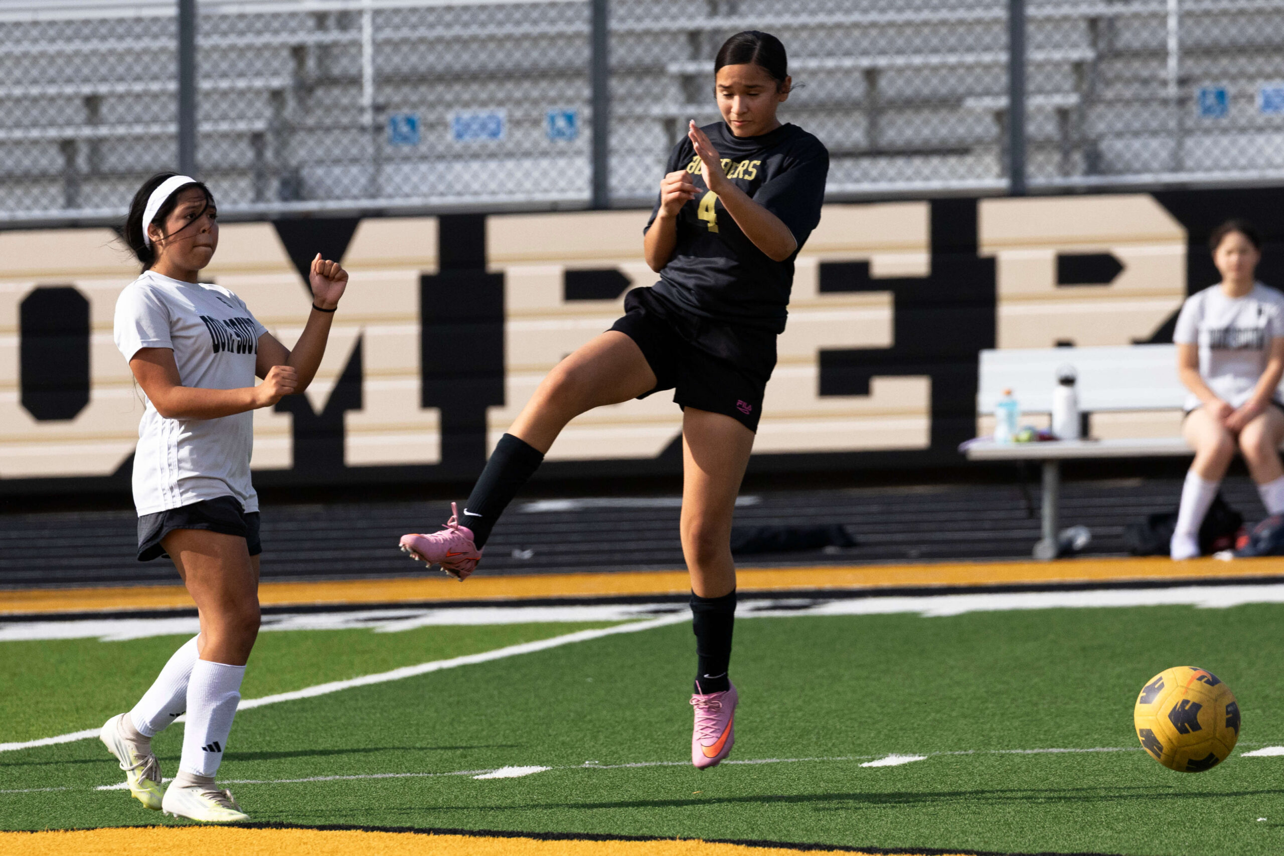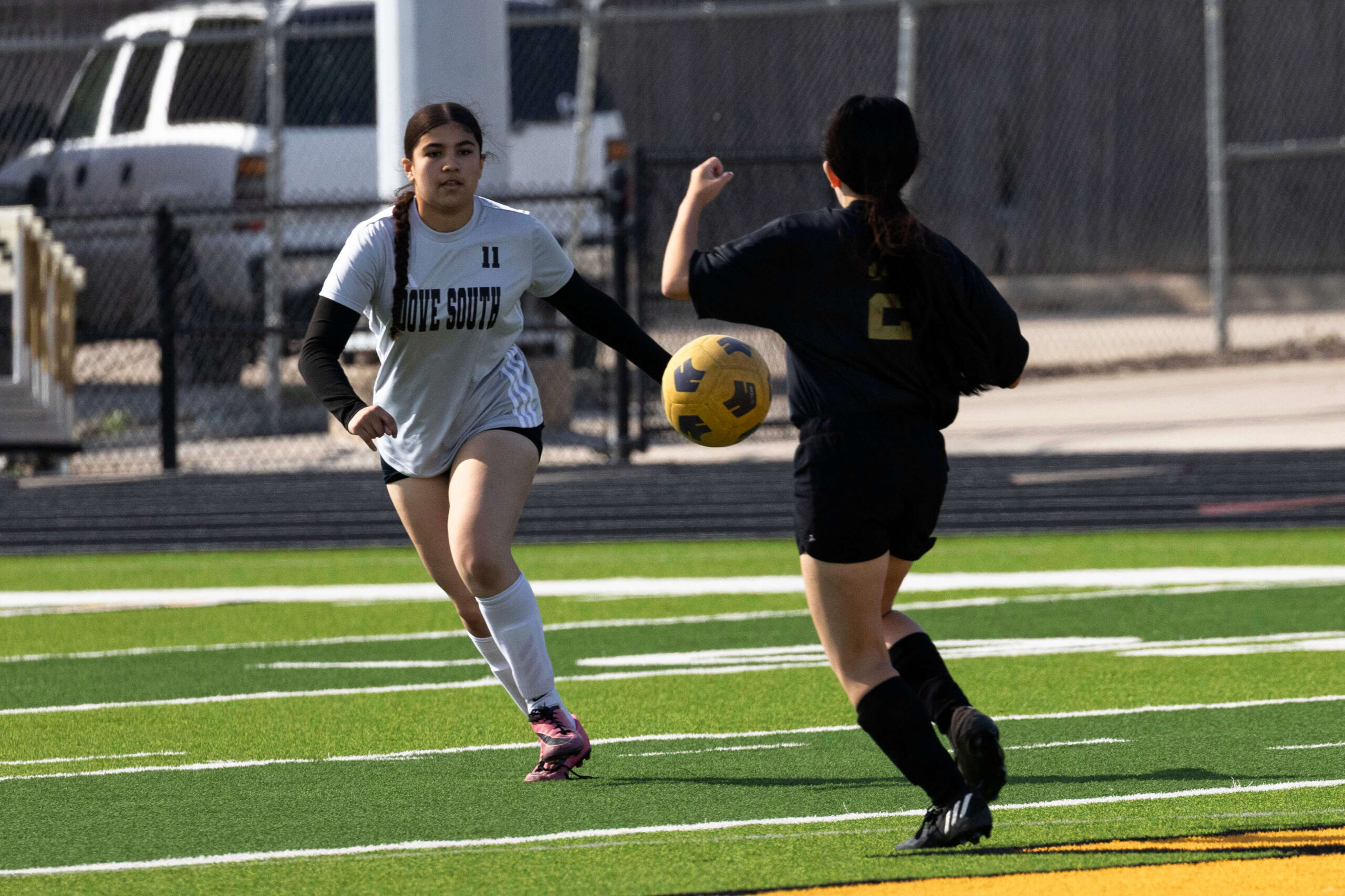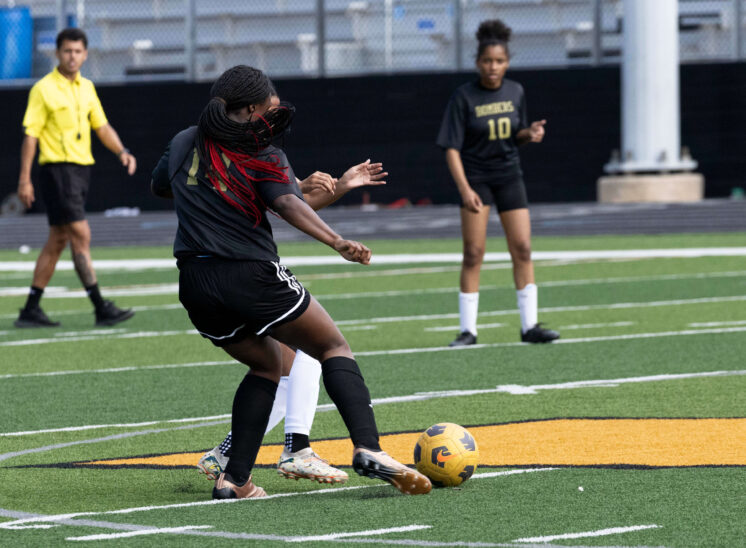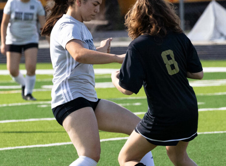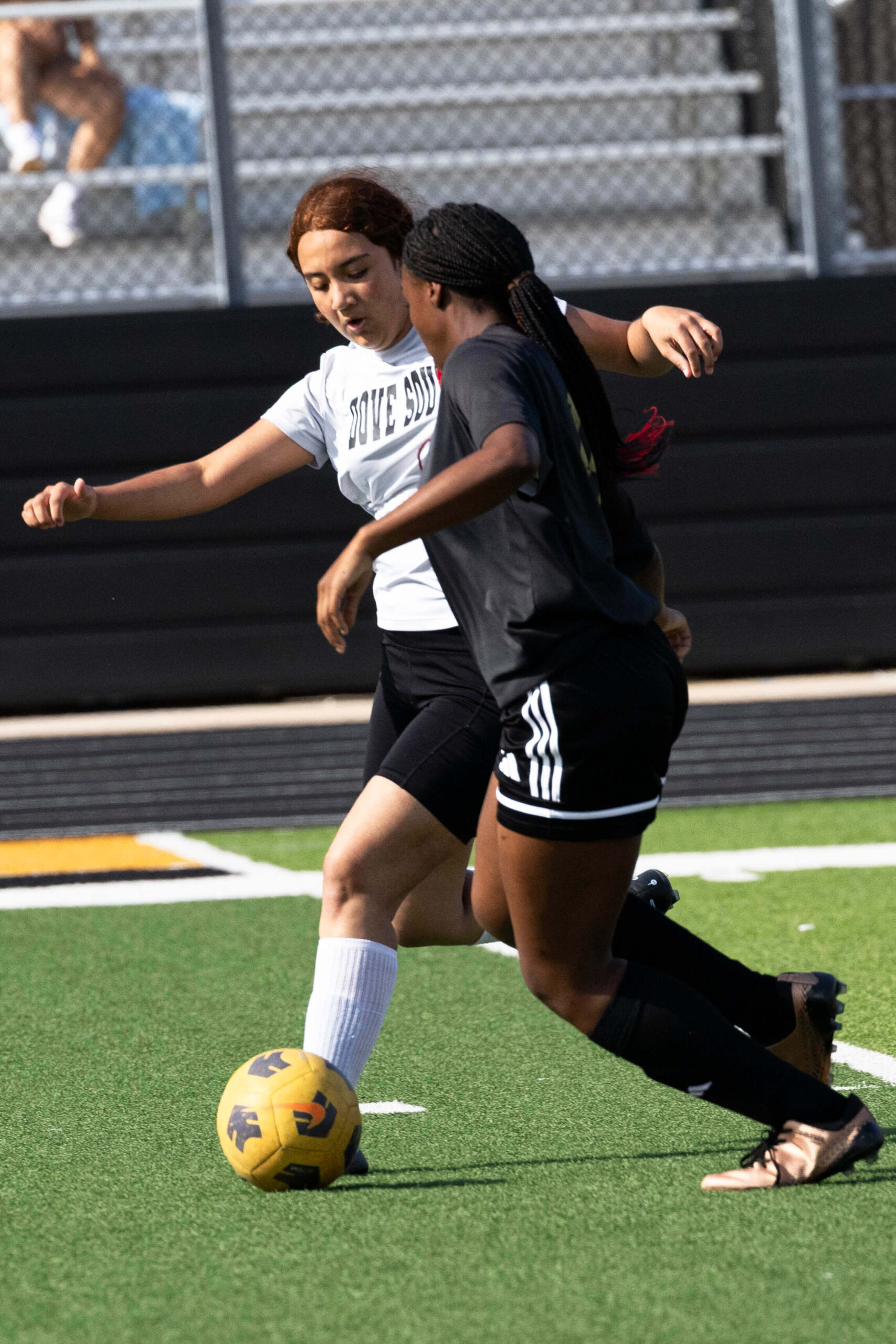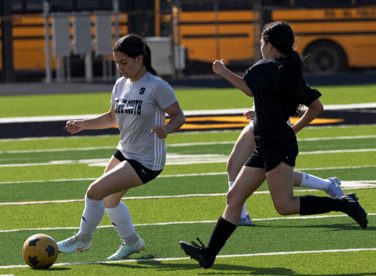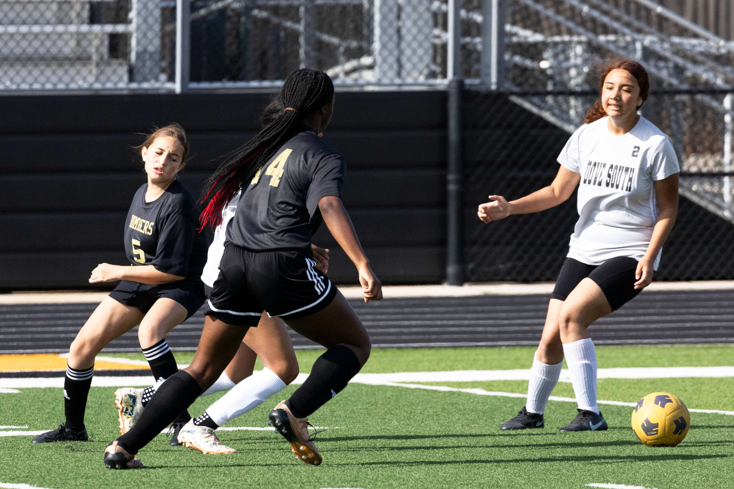 Midwest City middle school girls soccer player in black uniform dribbling the ball while being challenged by a defender