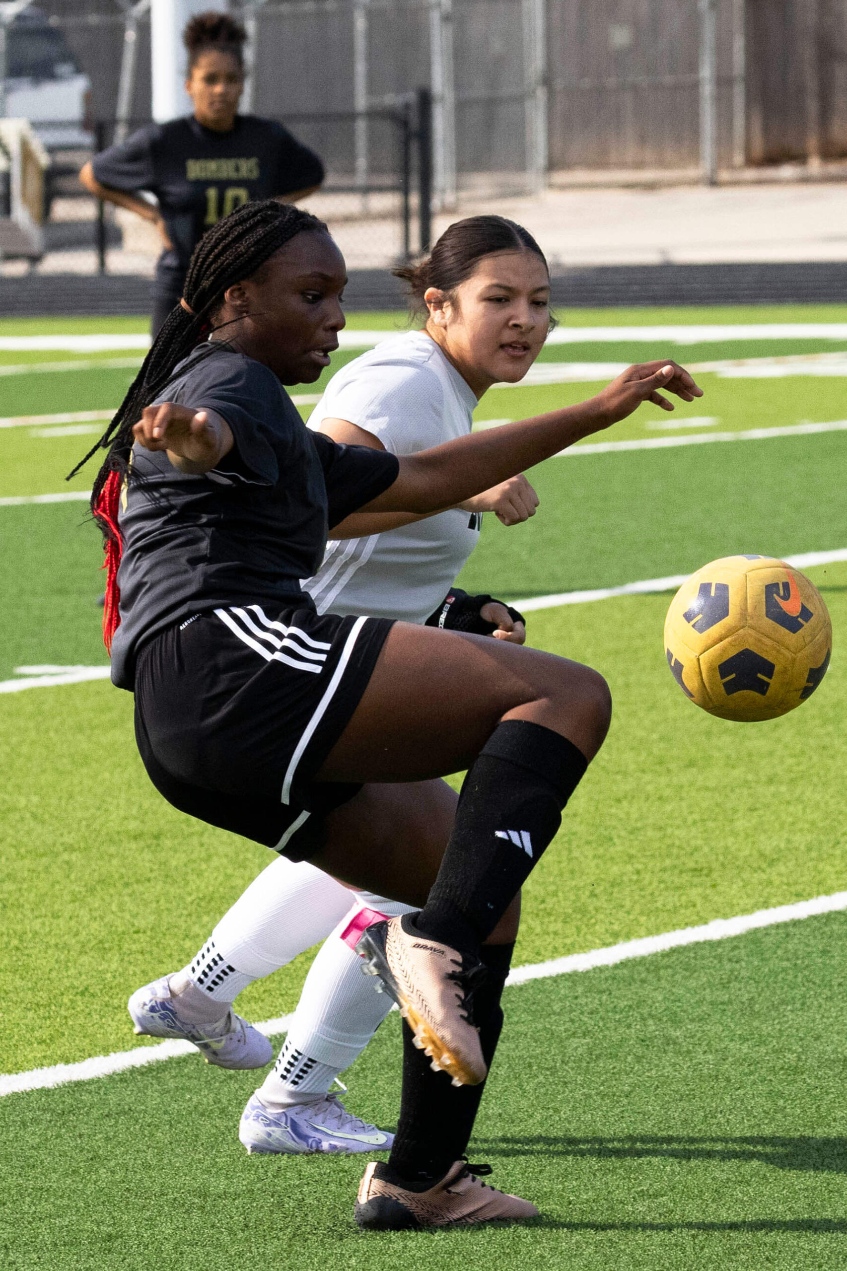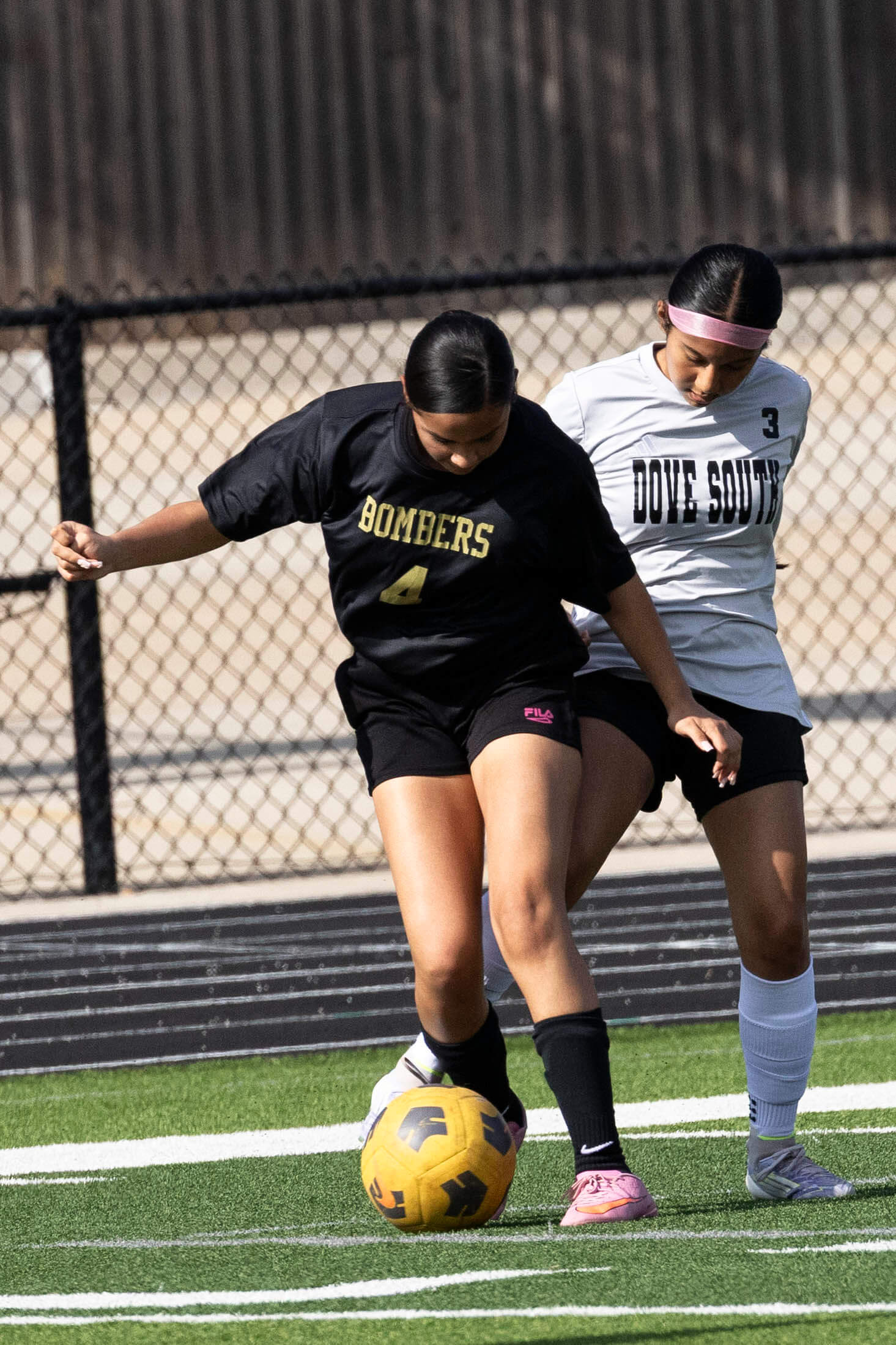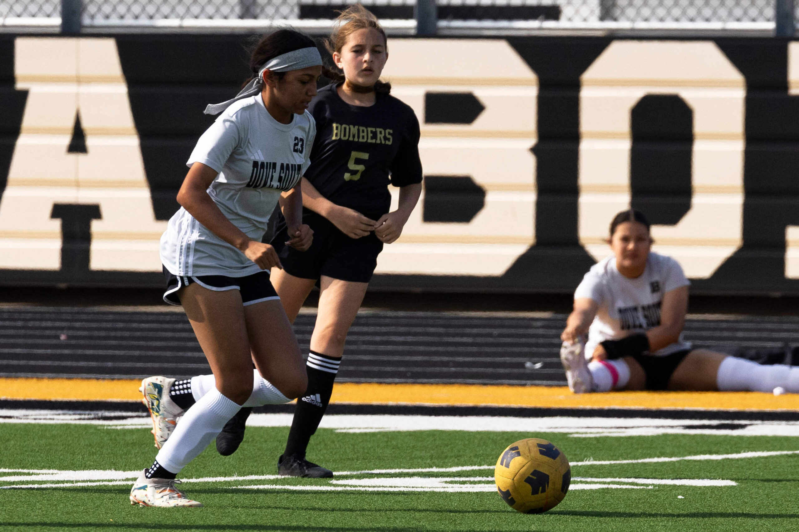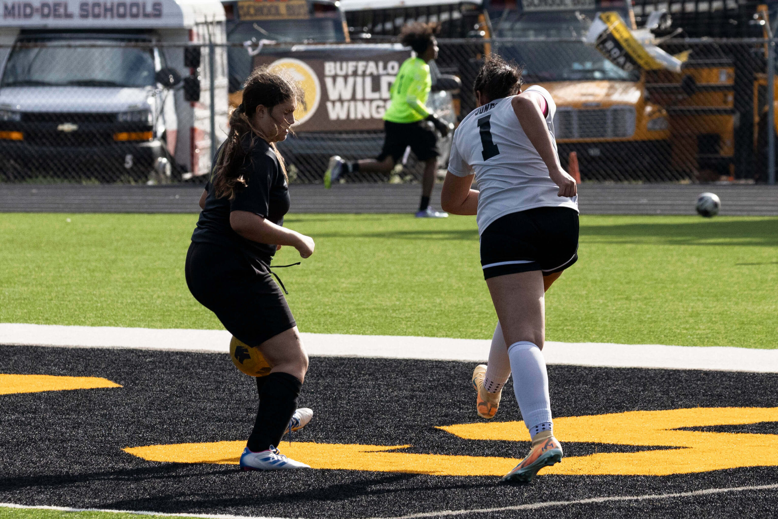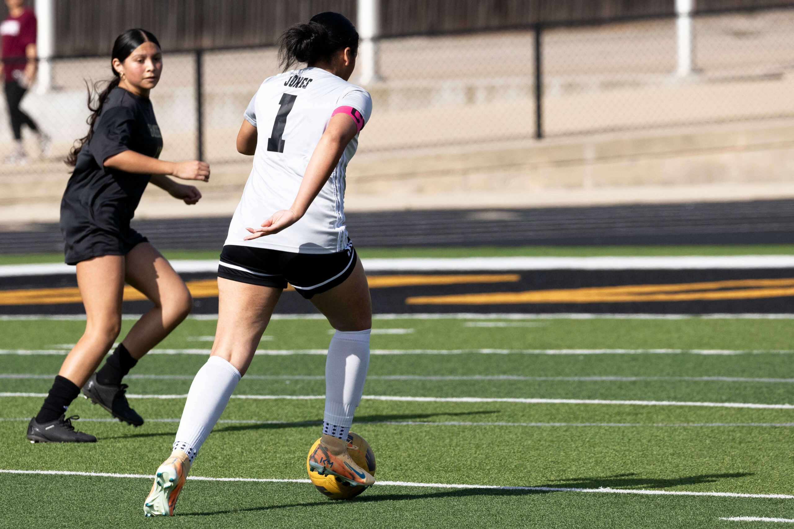 Midwest City middle school girls soccer player in black uniform dribbling the ball while being challenged by a defender