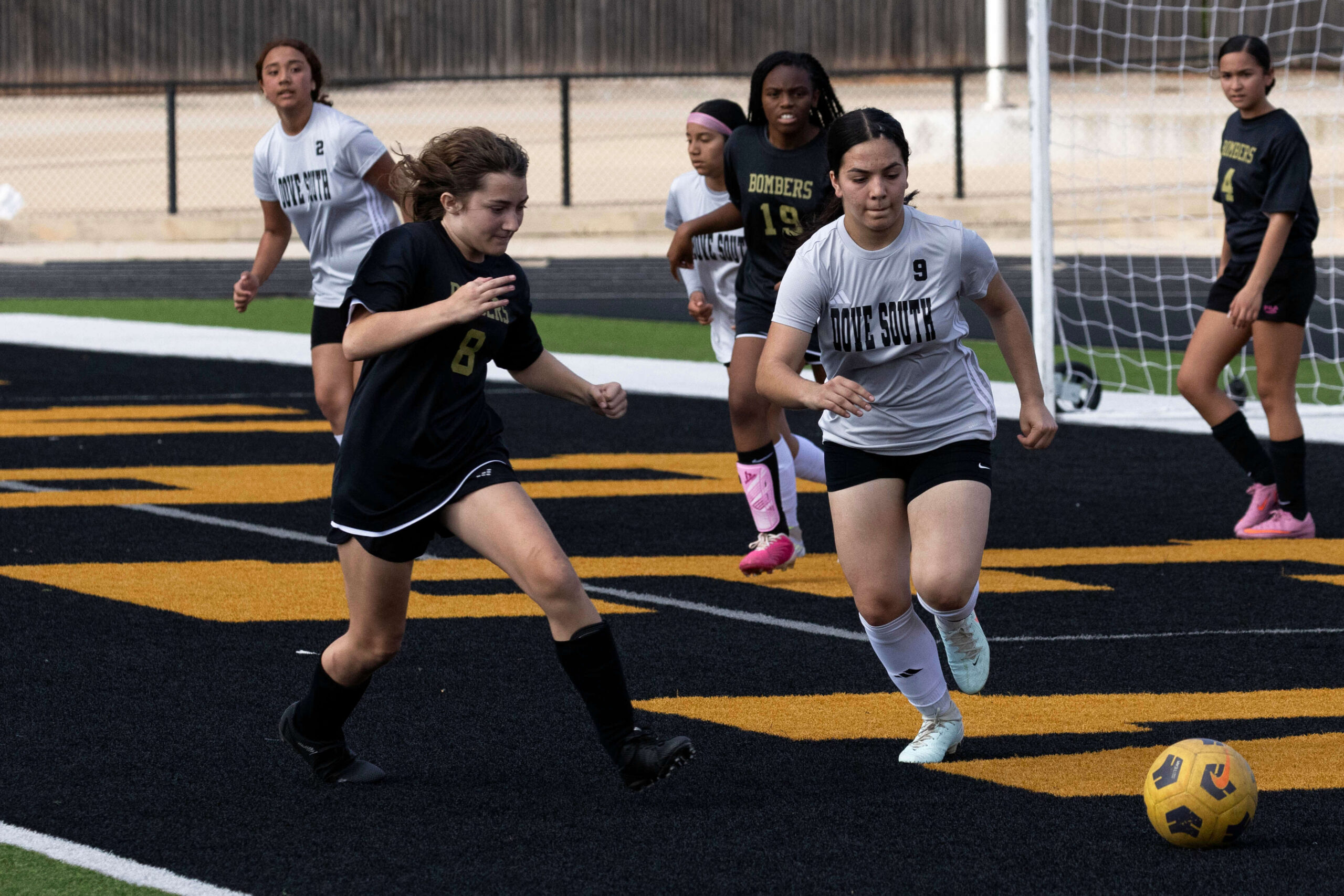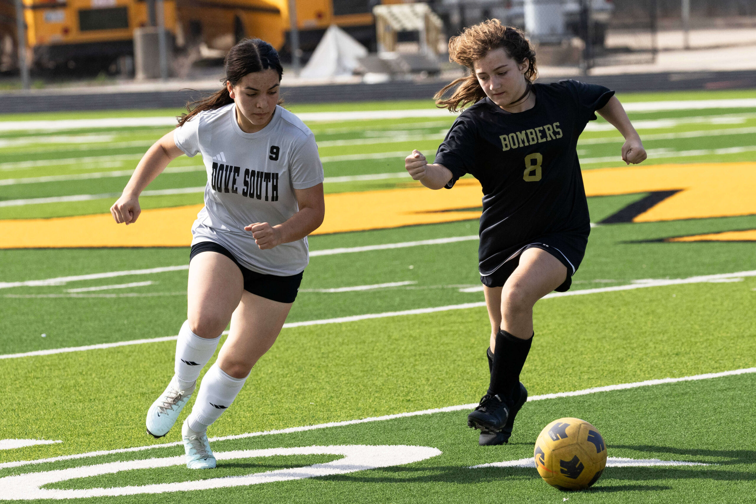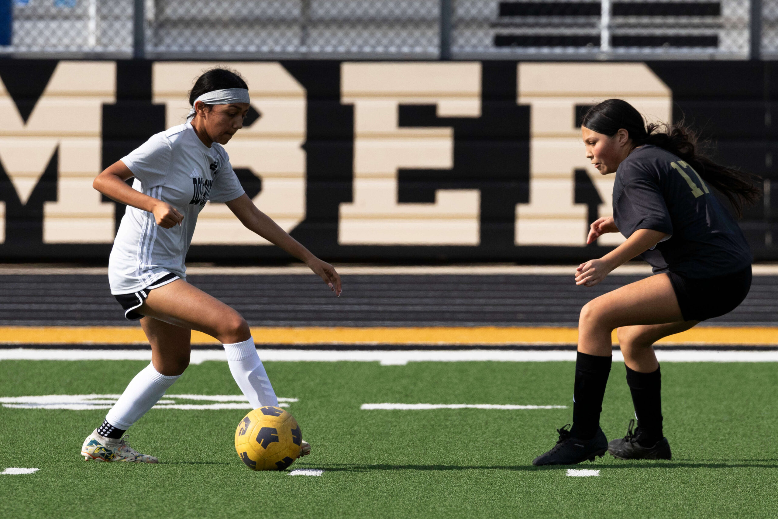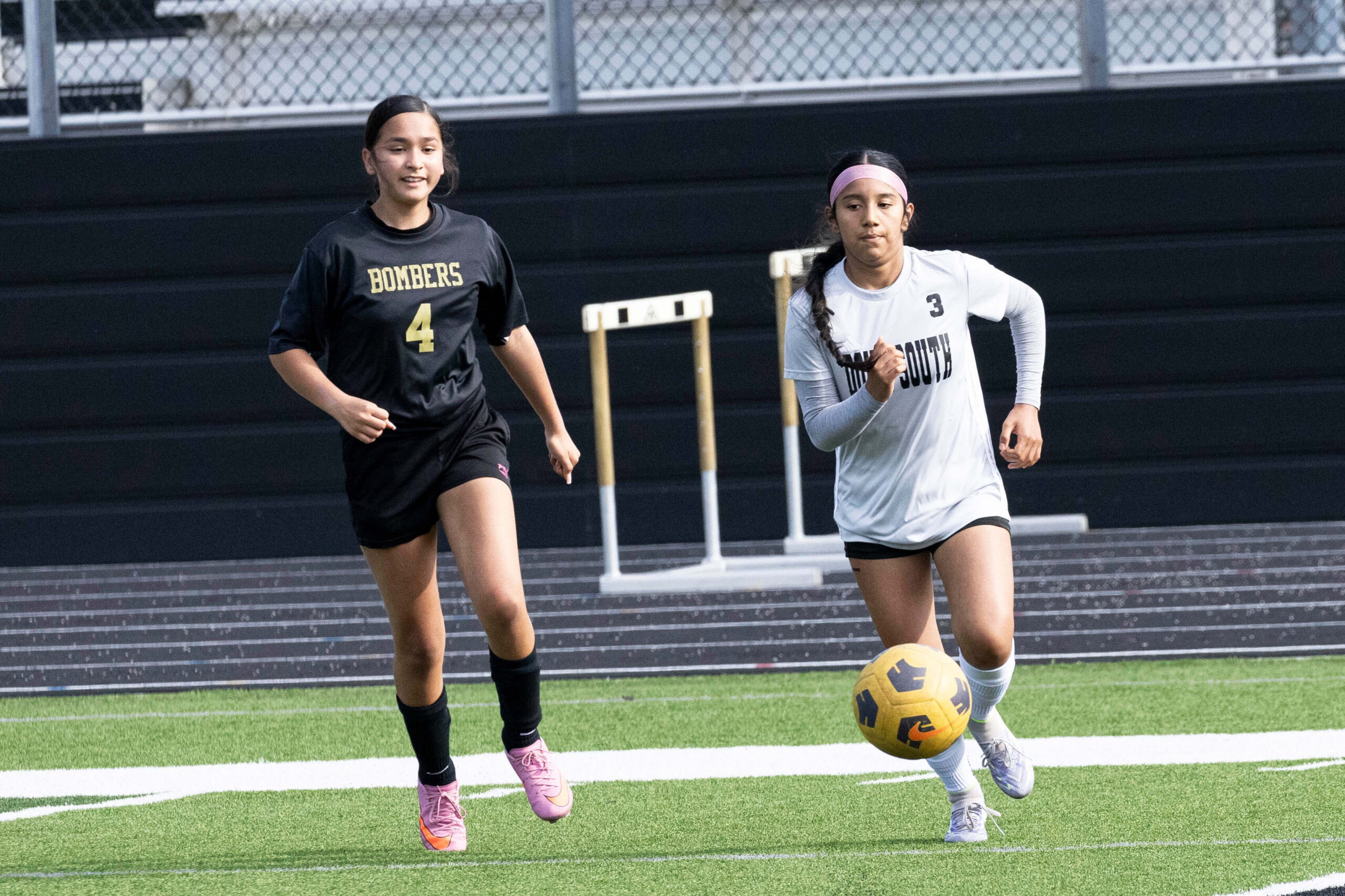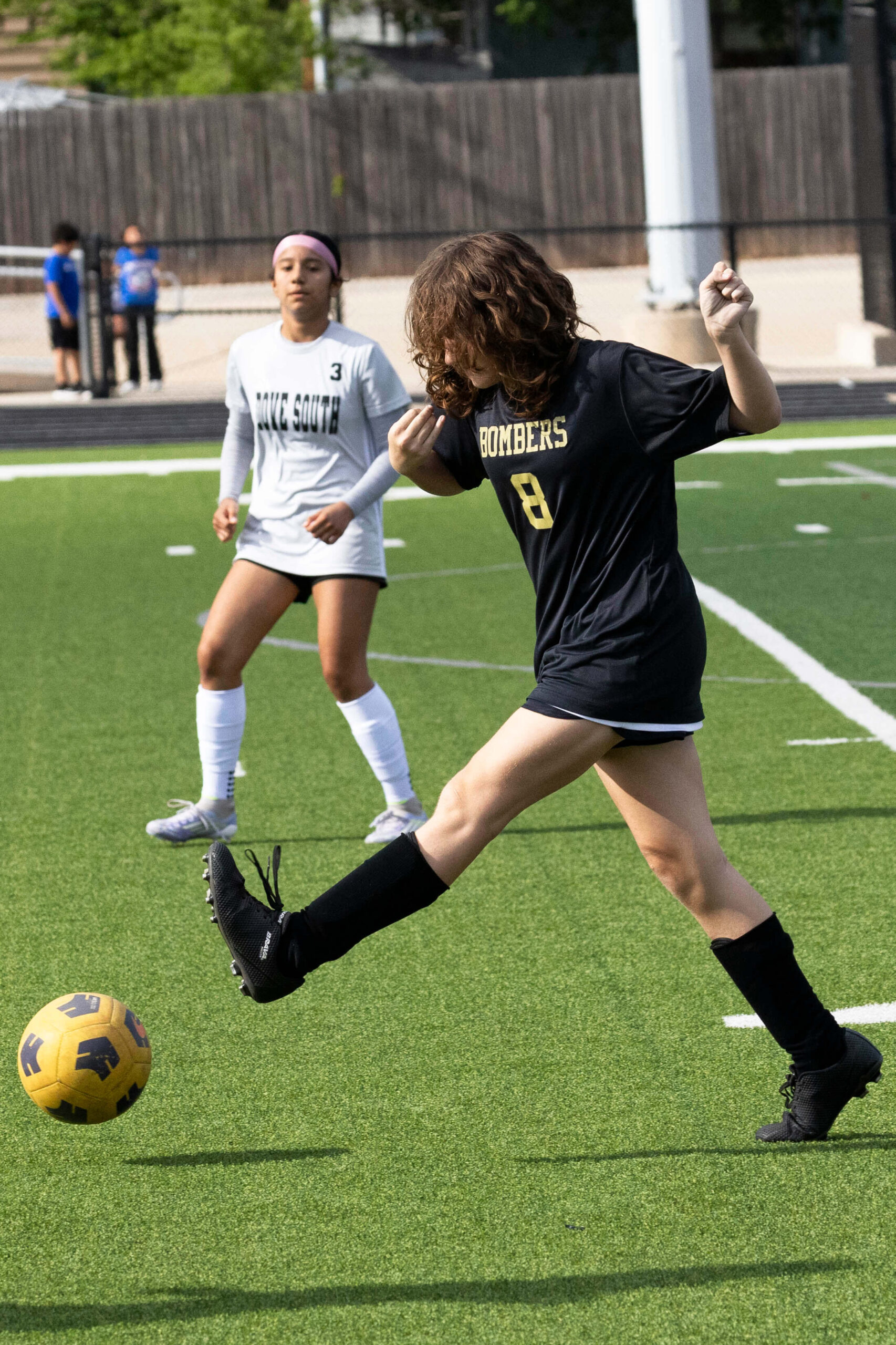 Midwest City middle school girls soccer player in black uniform dribbling the ball while being challenged by a defender