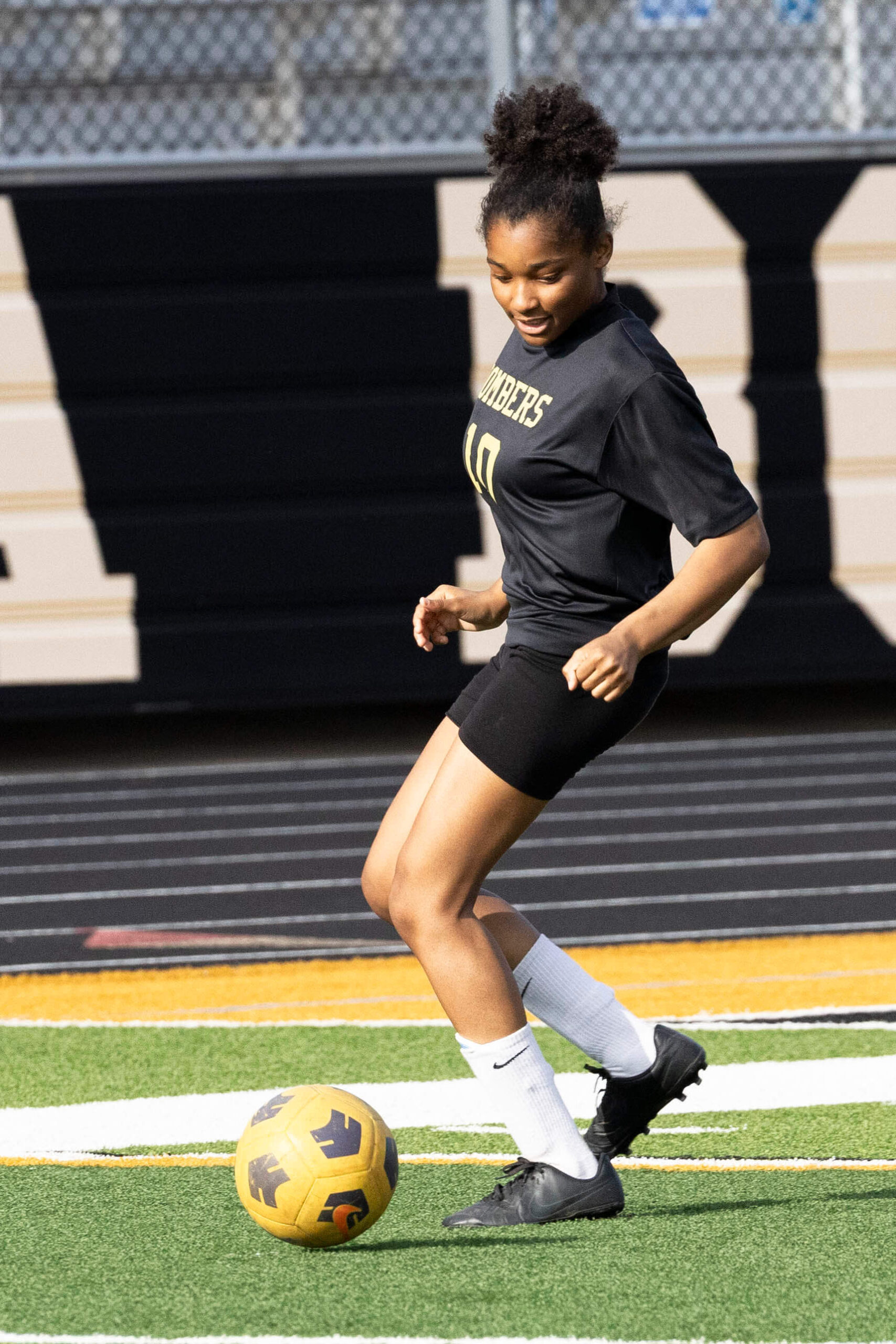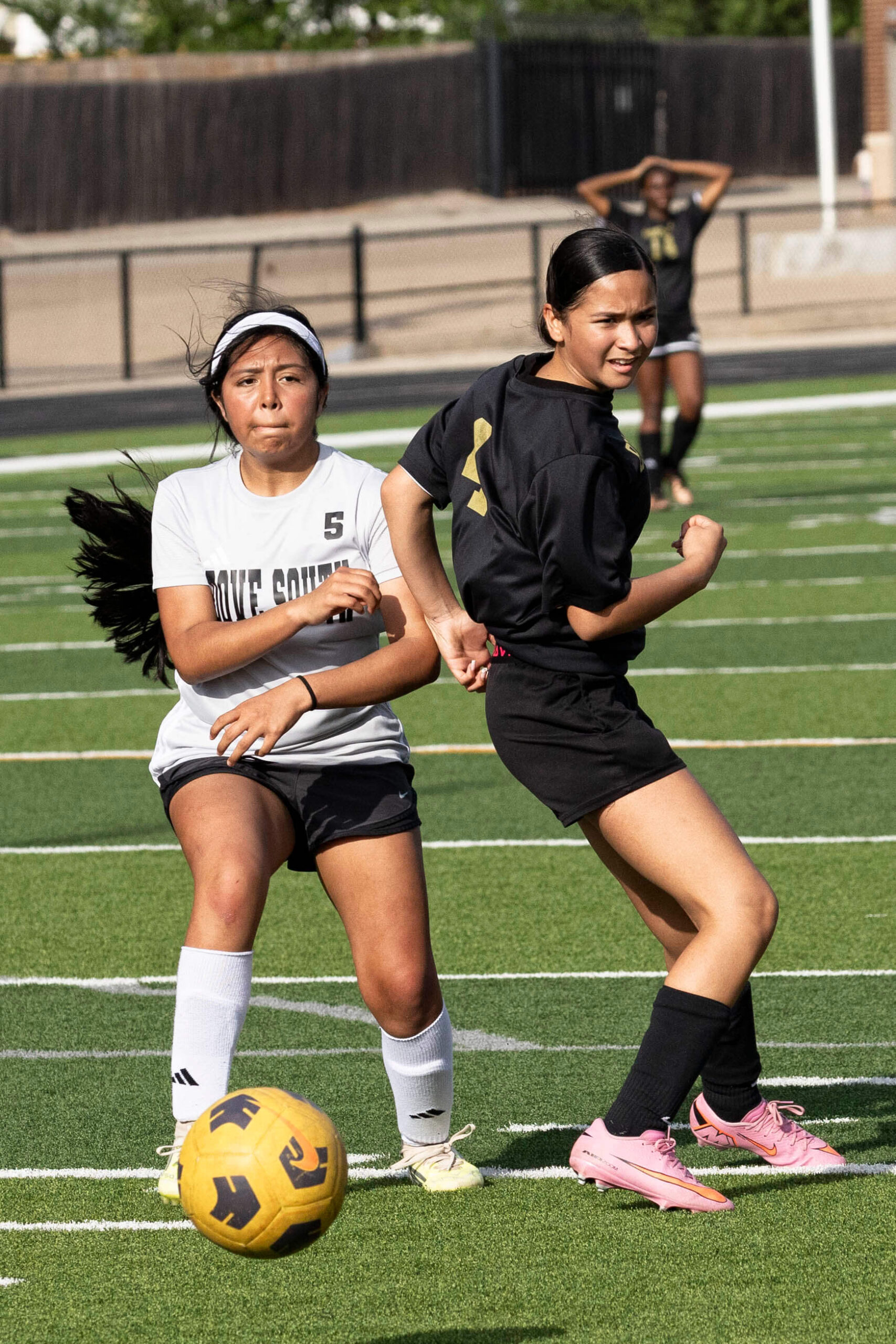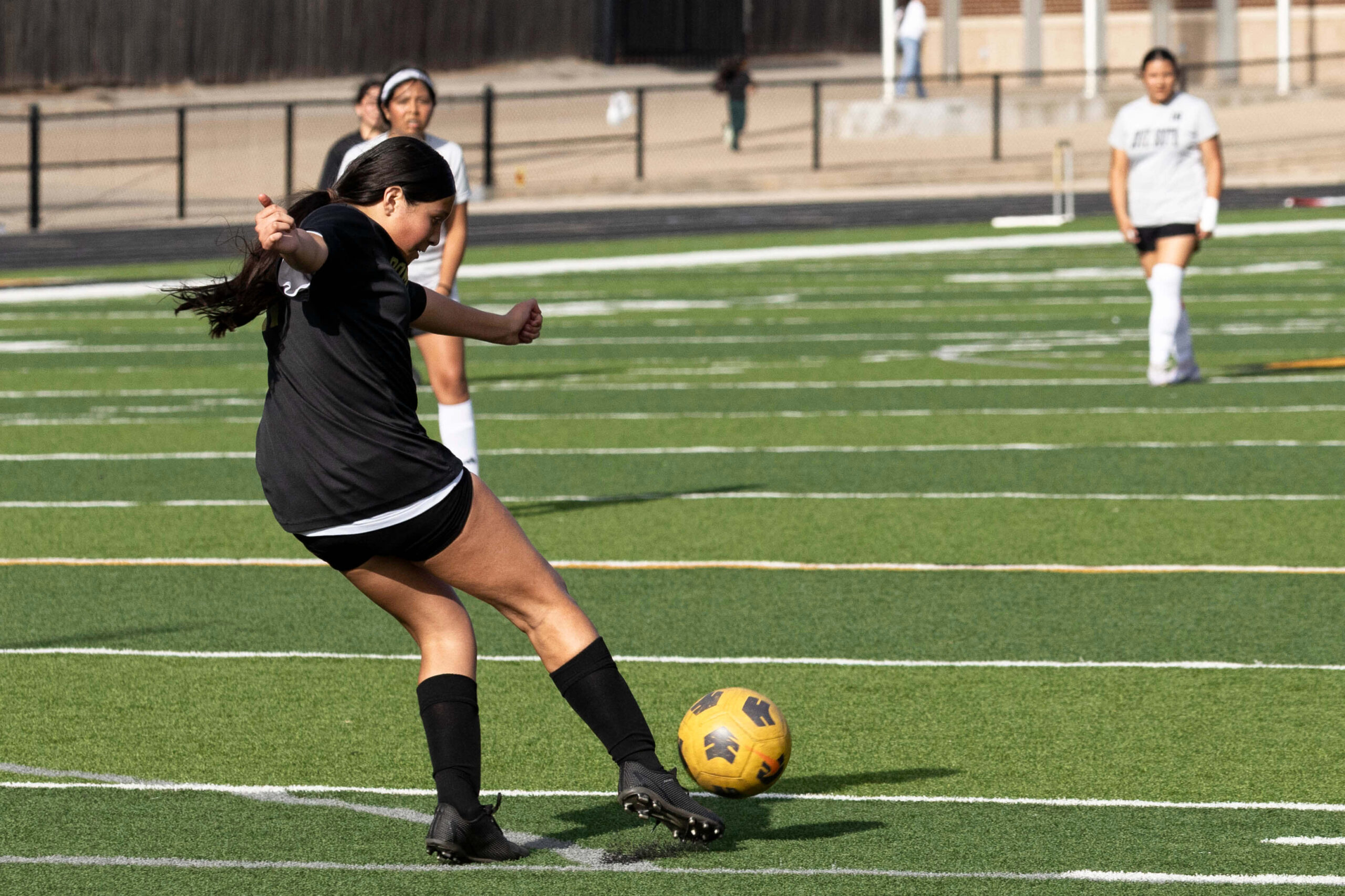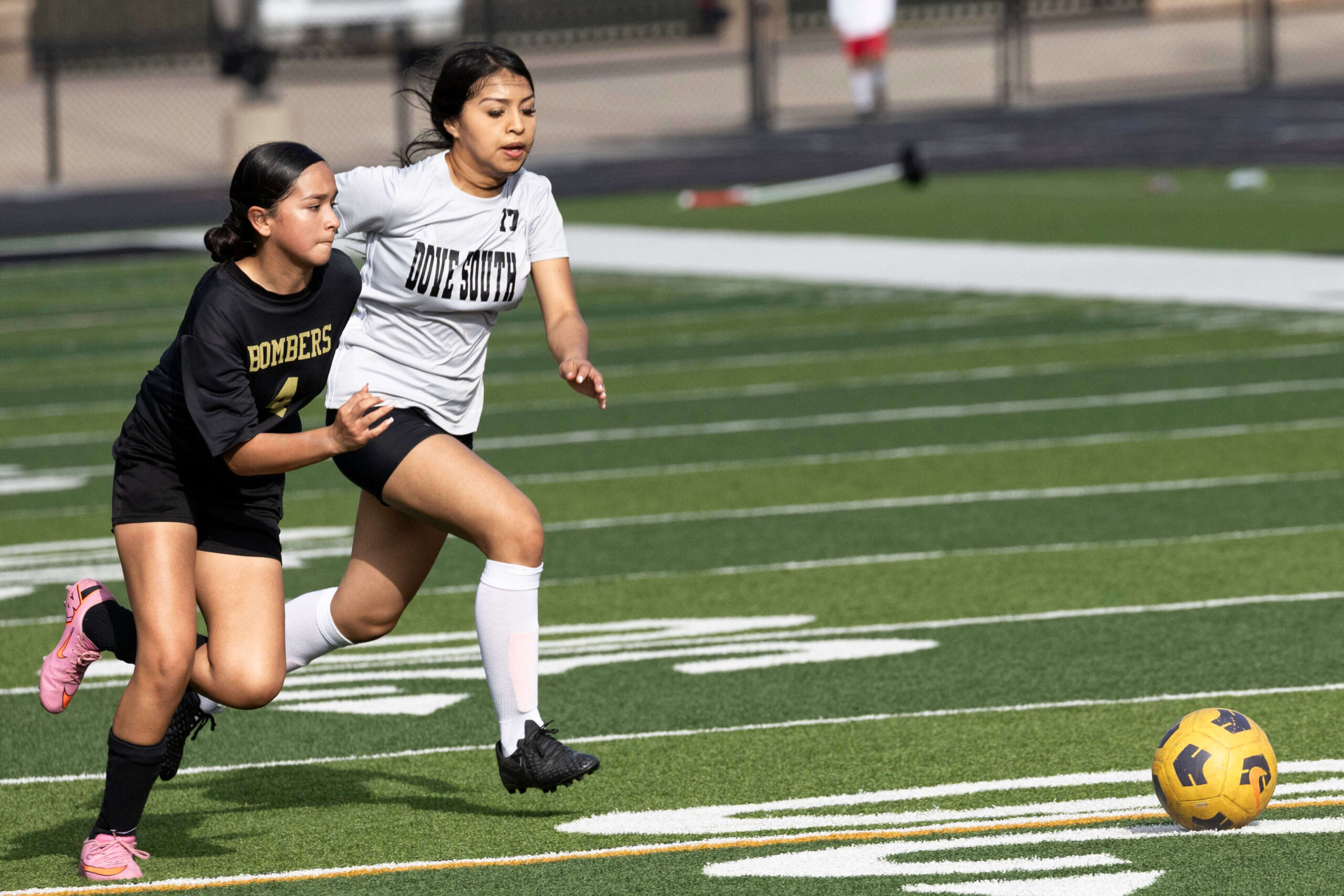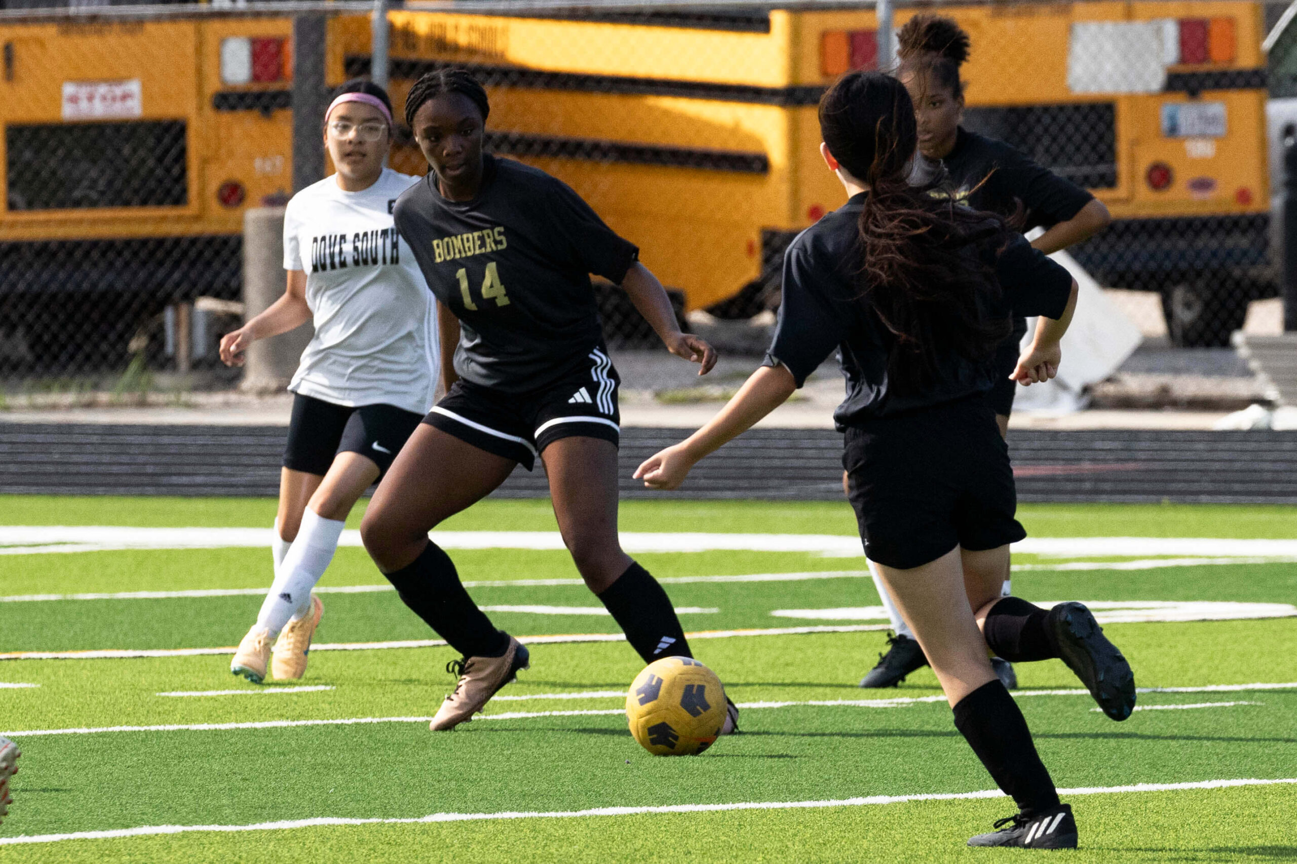 Midwest City middle school girls soccer player in black uniform dribbling the ball while being challenged by a defender