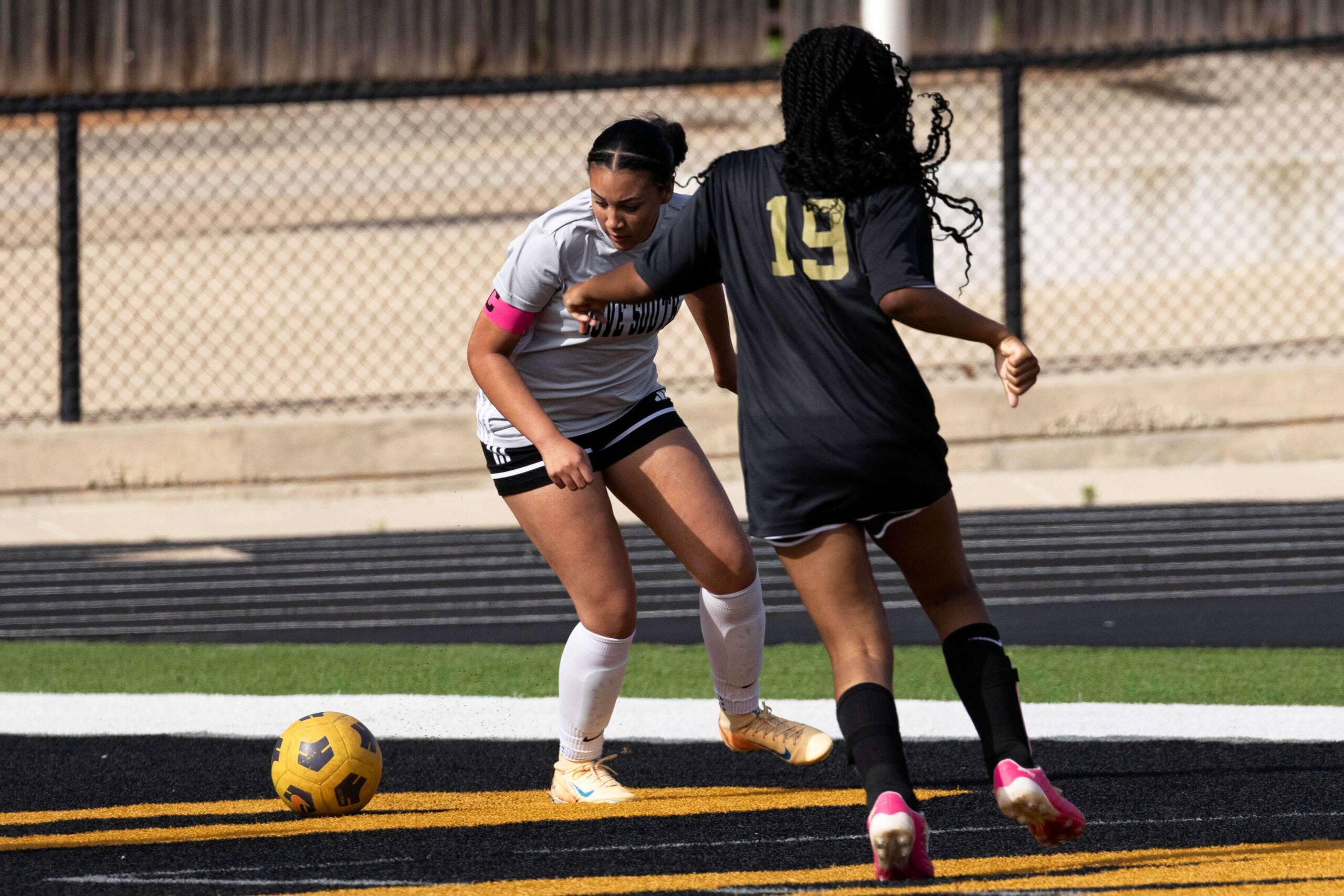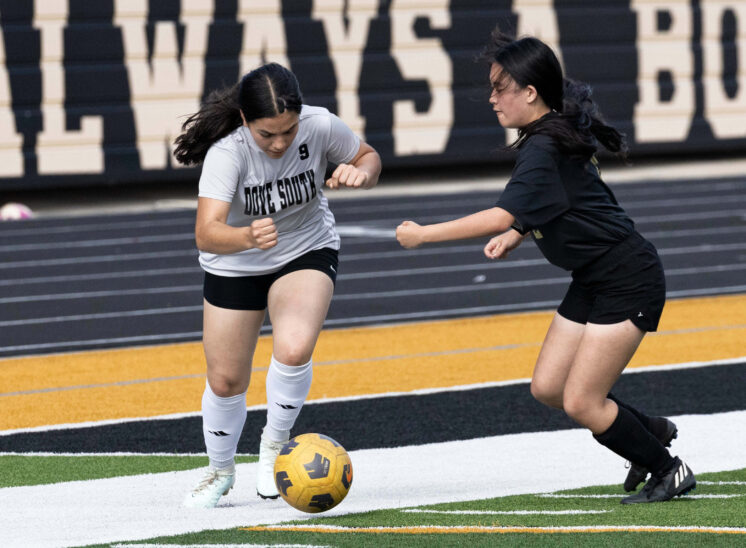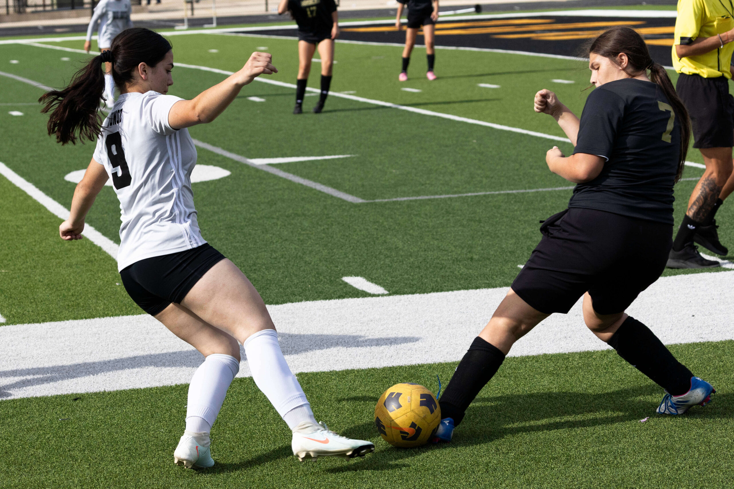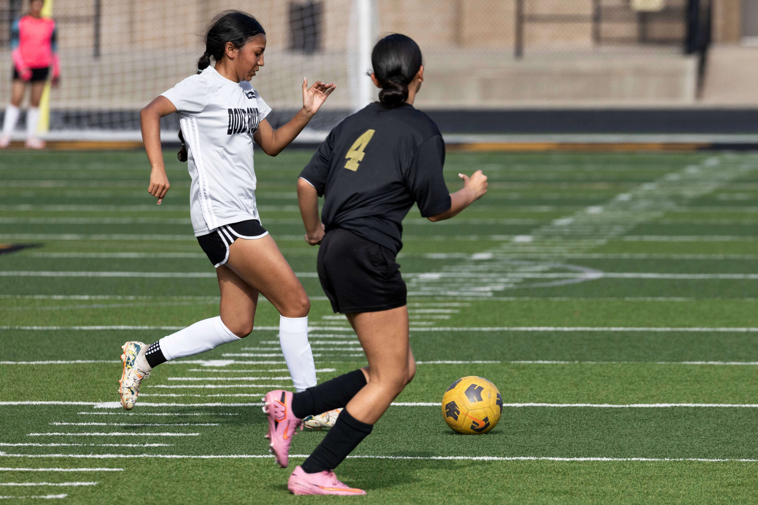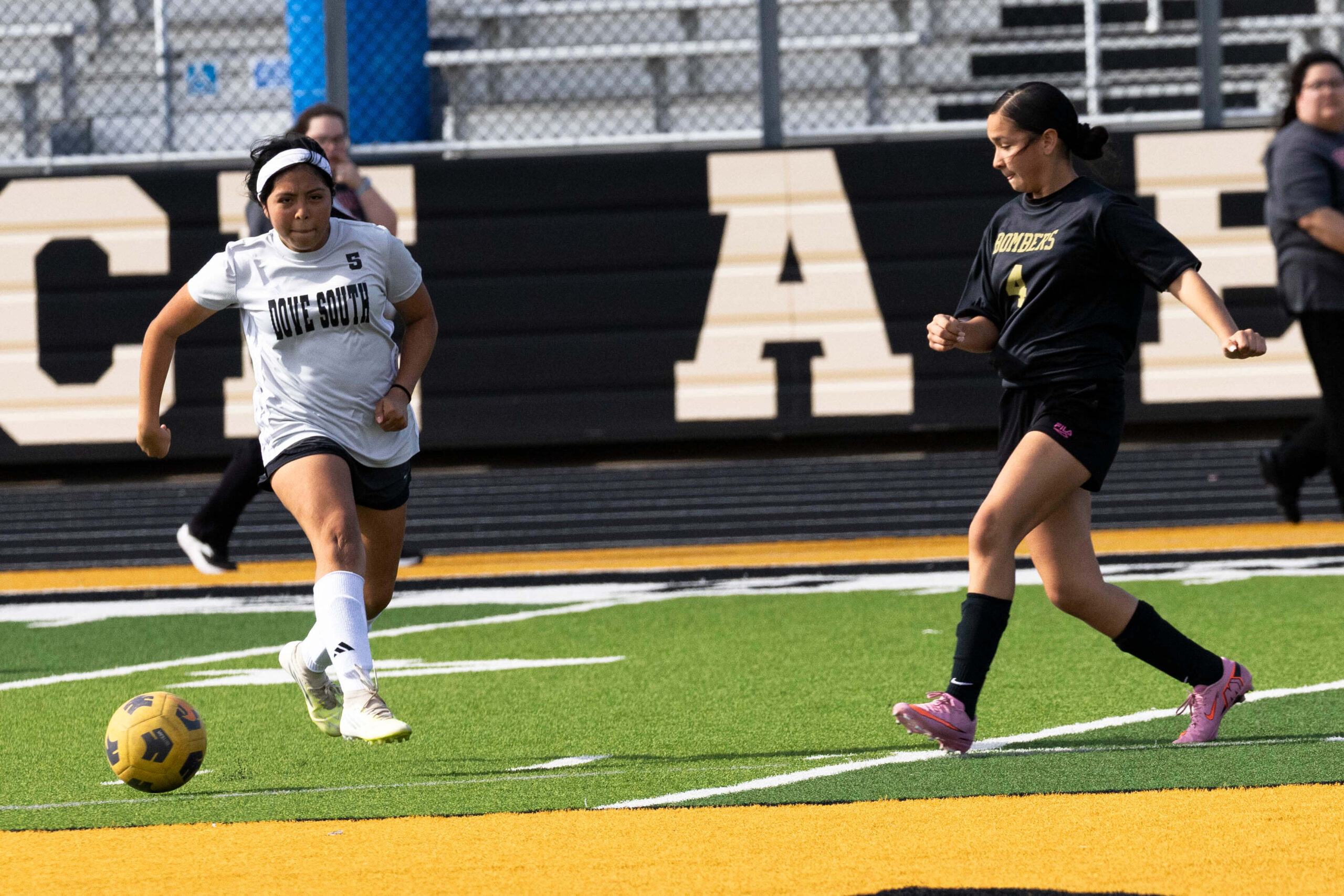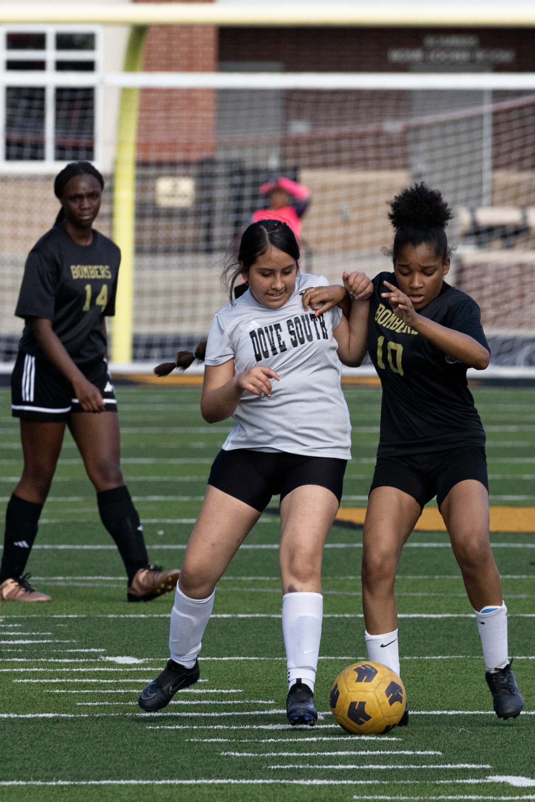 Midwest City middle school girls soccer player in black uniform dribbling the ball while being challenged by a defender