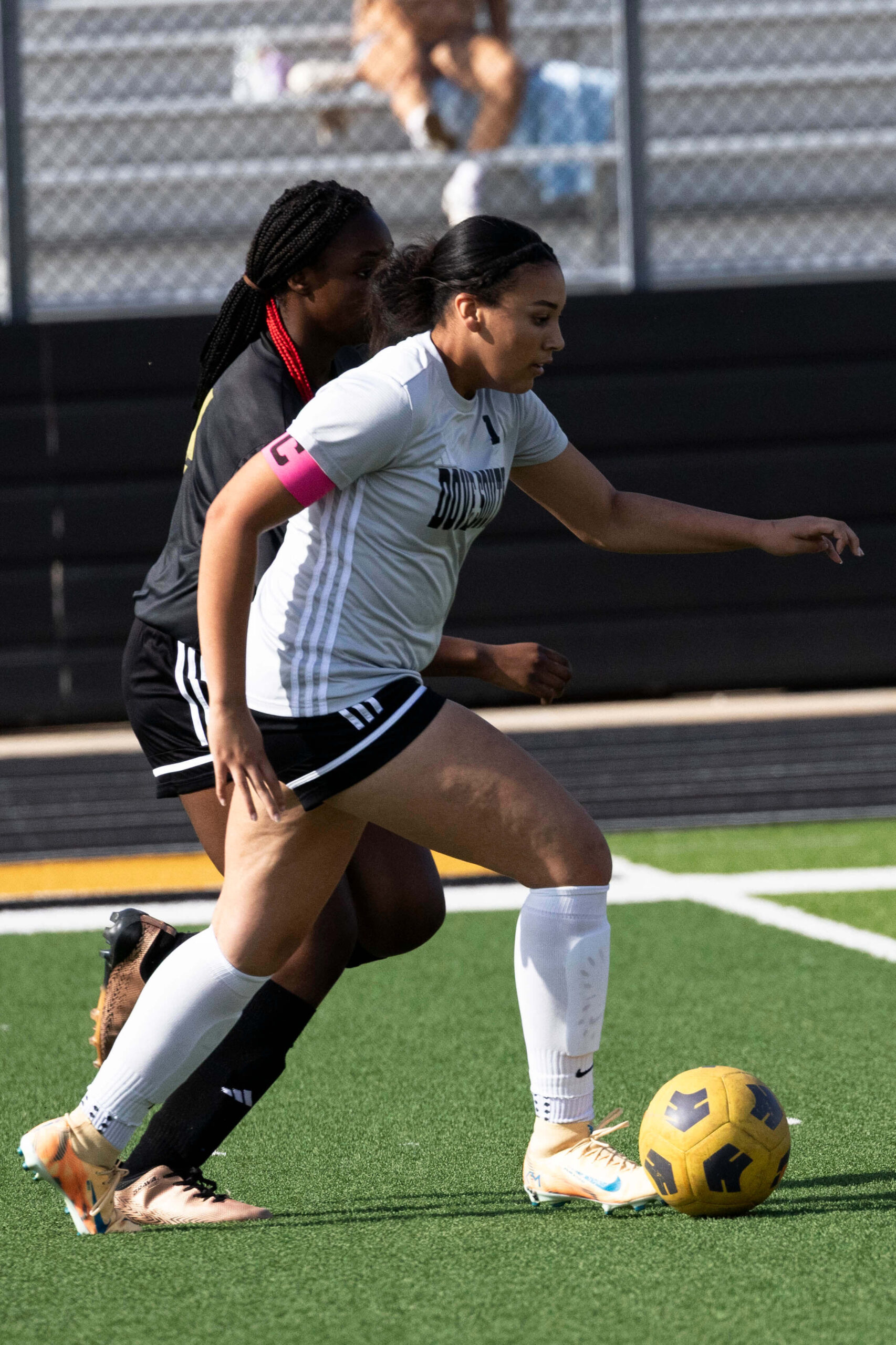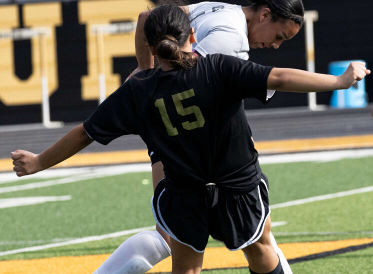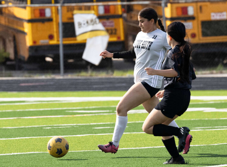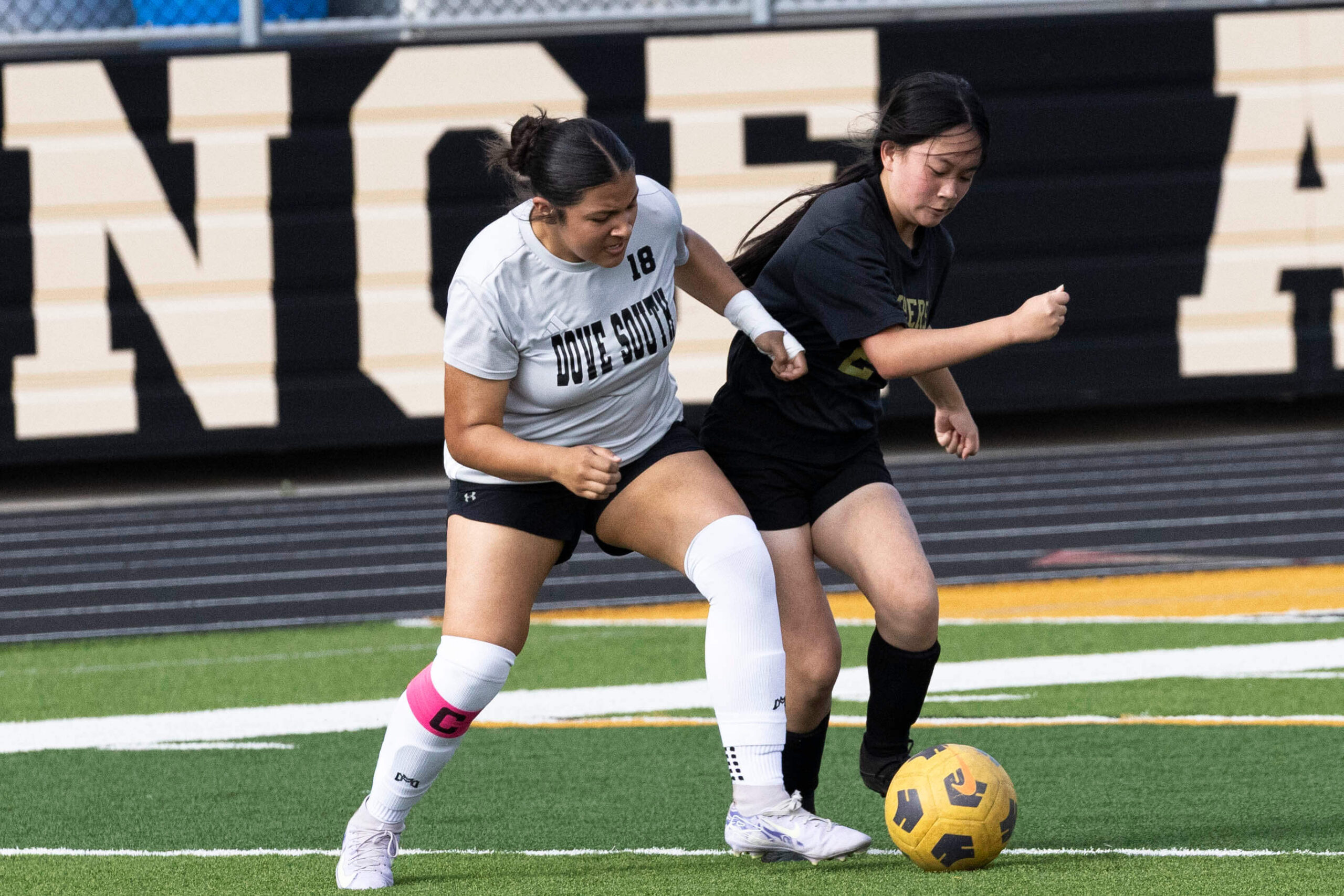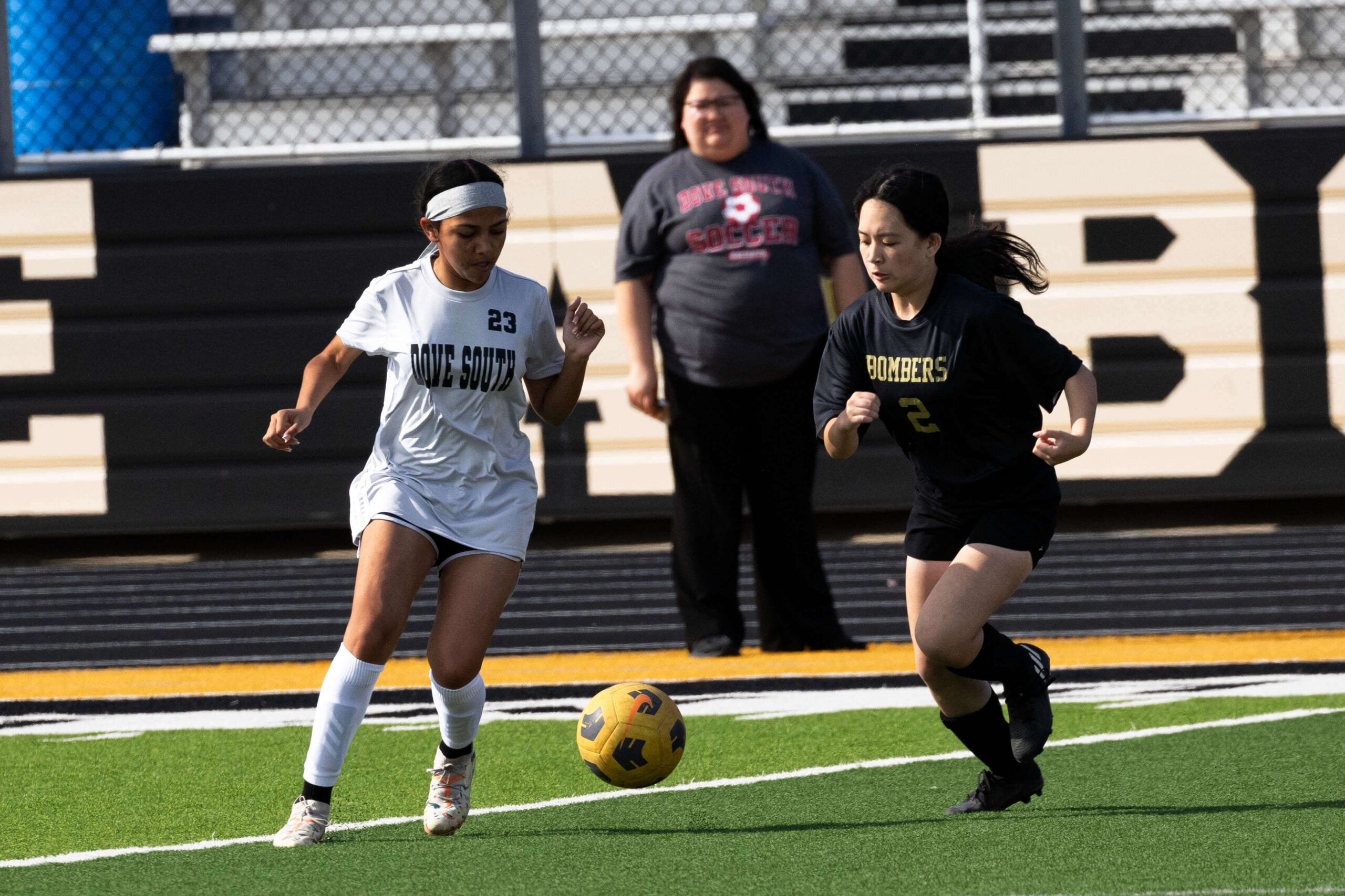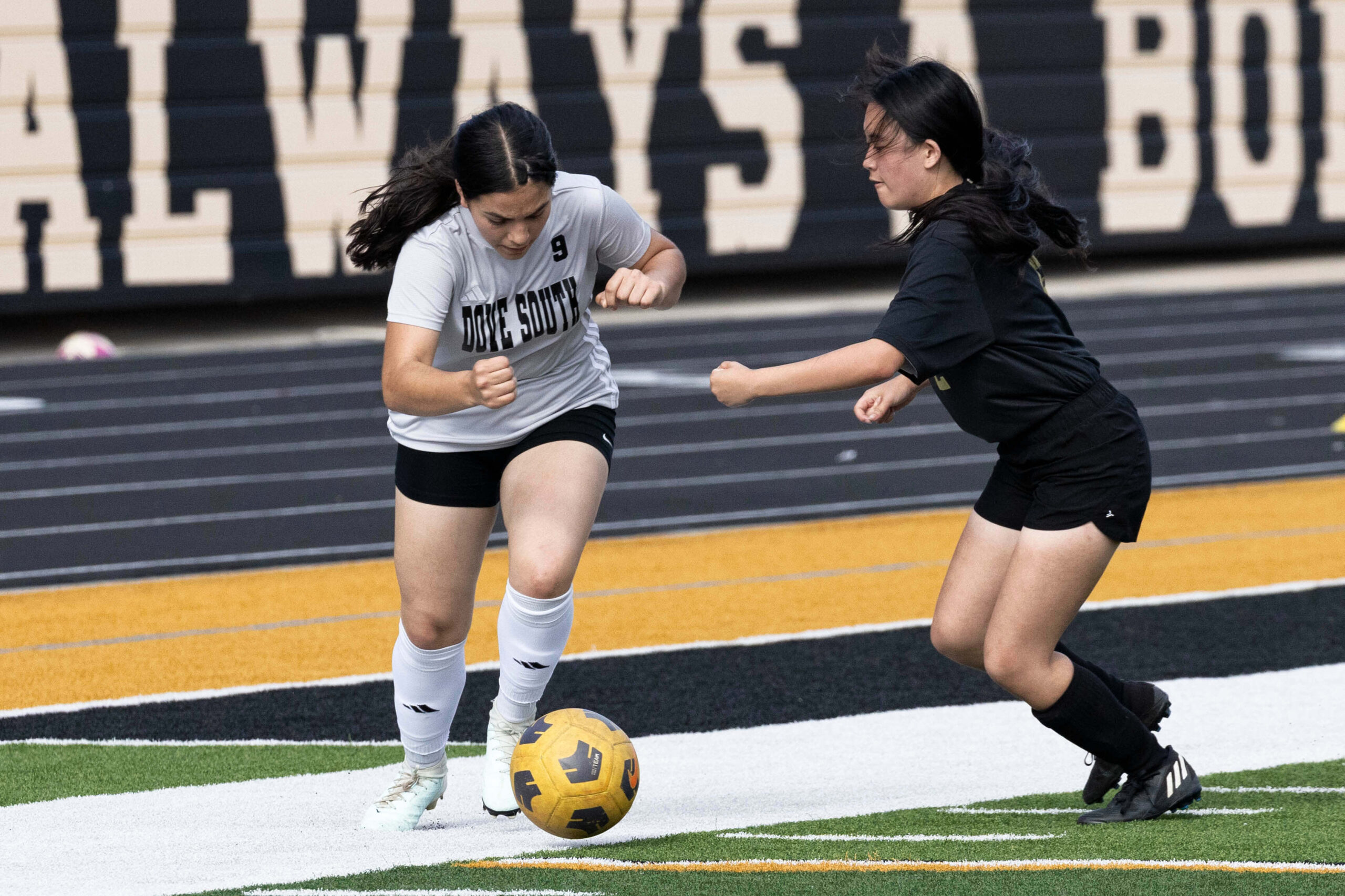 Midwest City middle school girls soccer player in black uniform dribbling the ball while being challenged by a defender