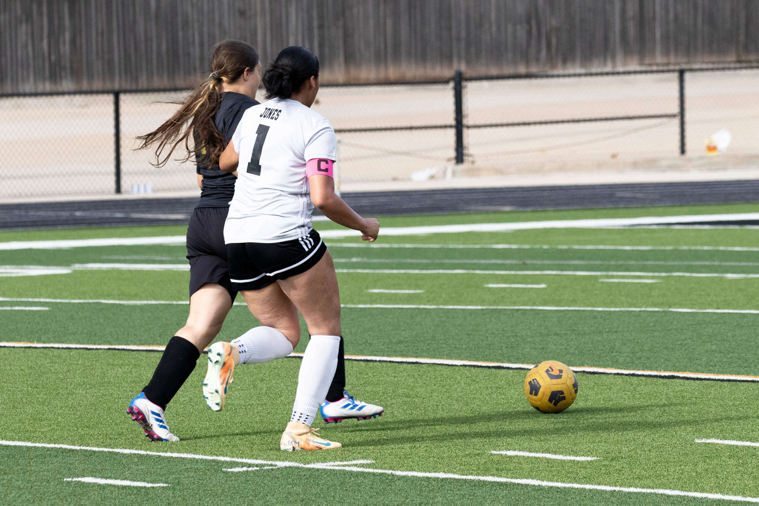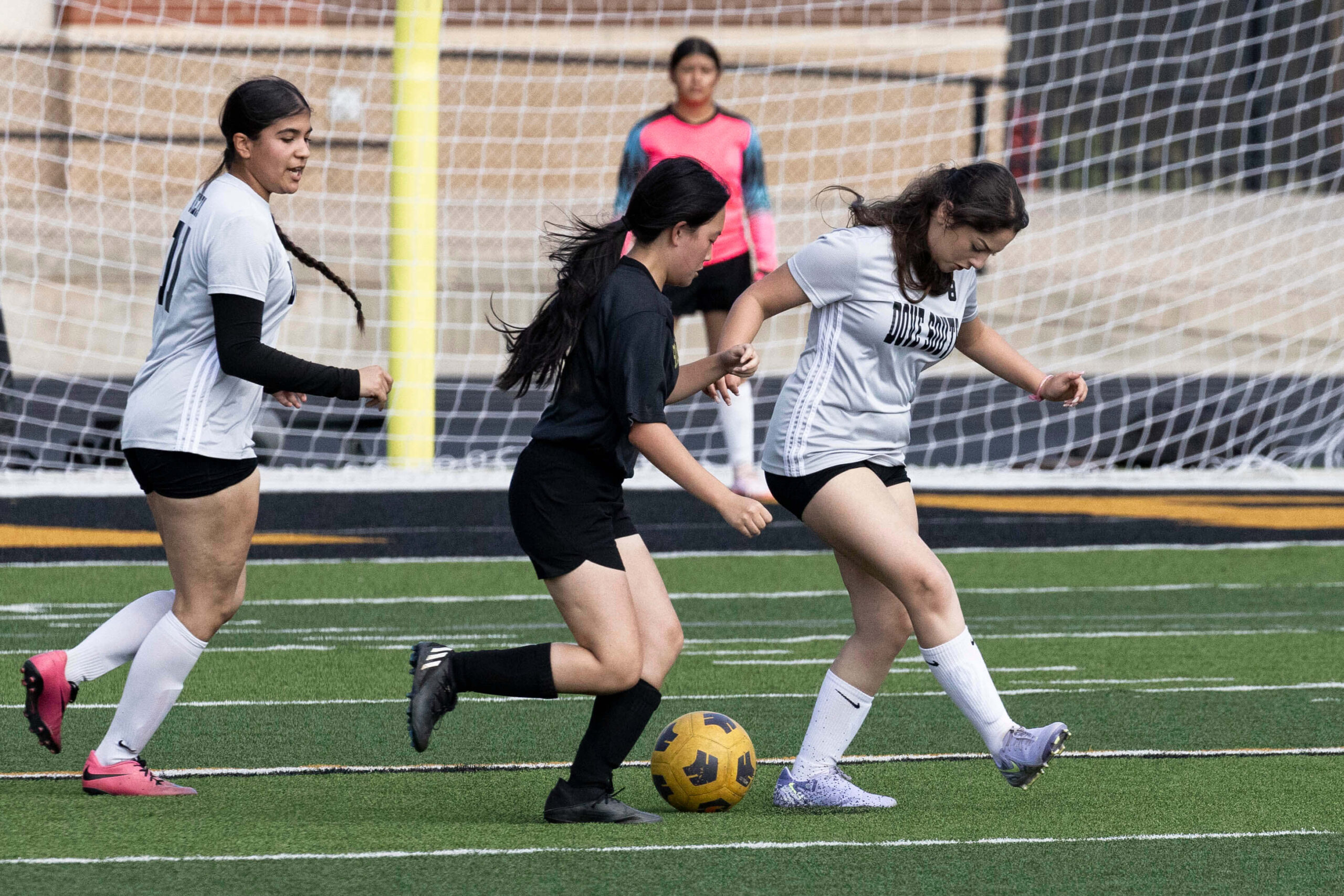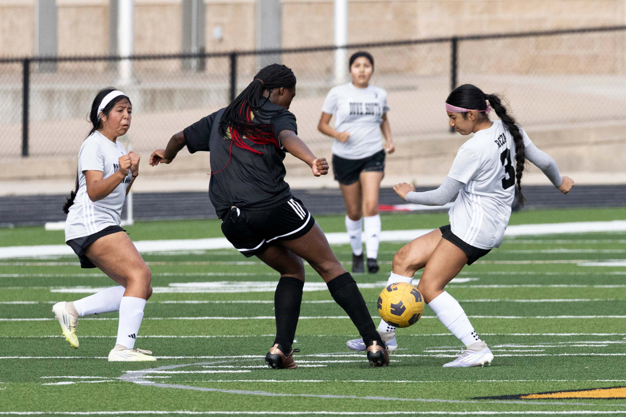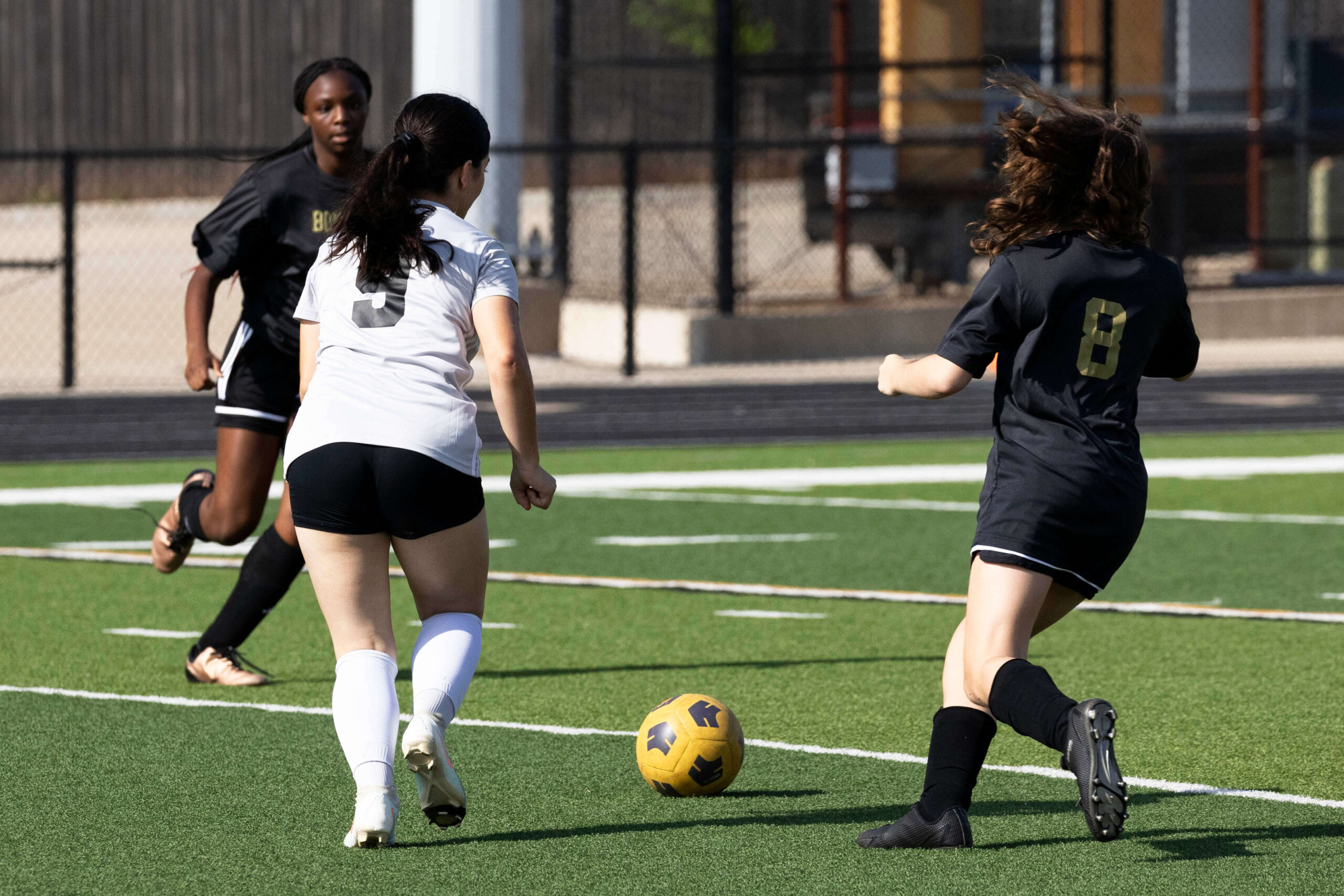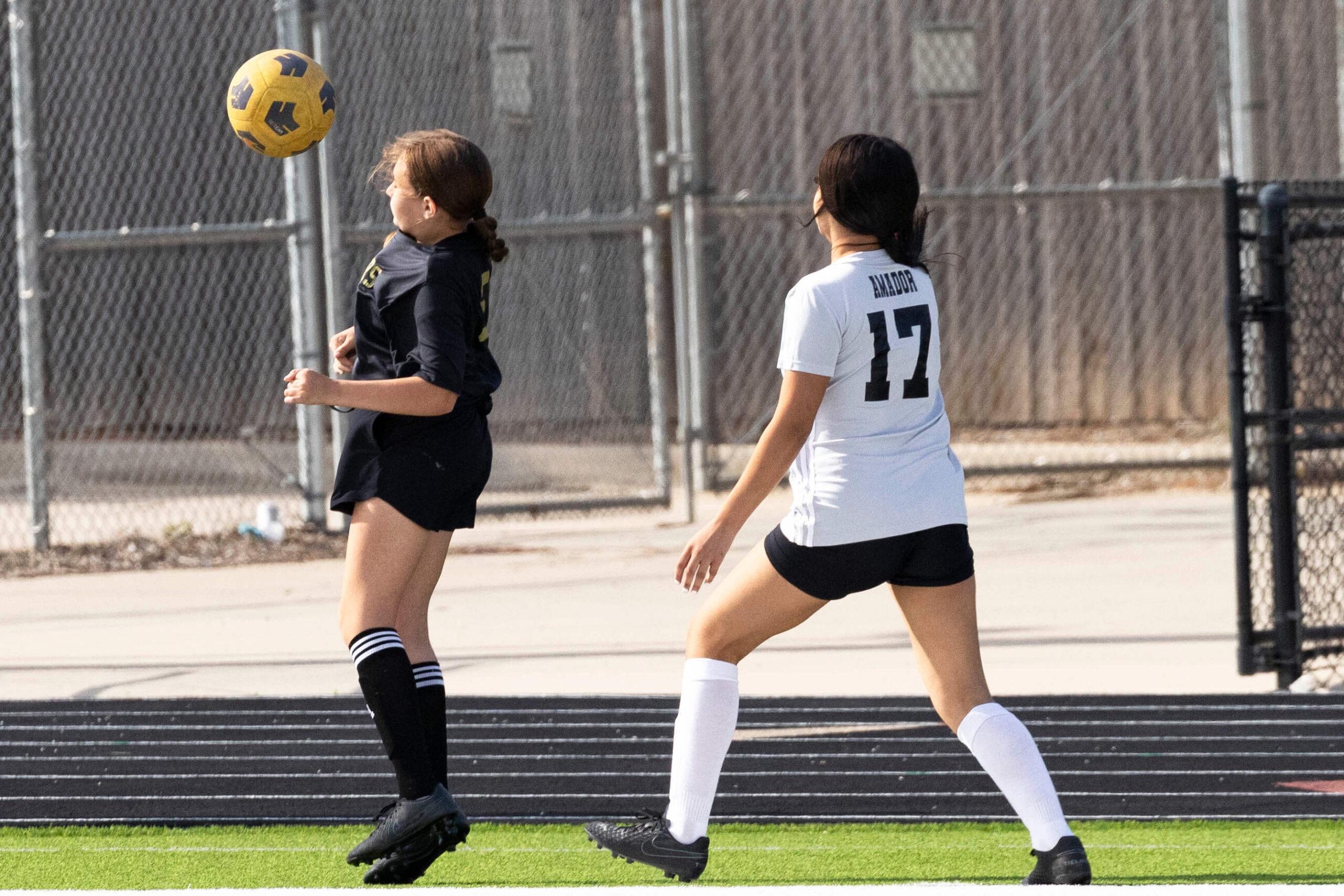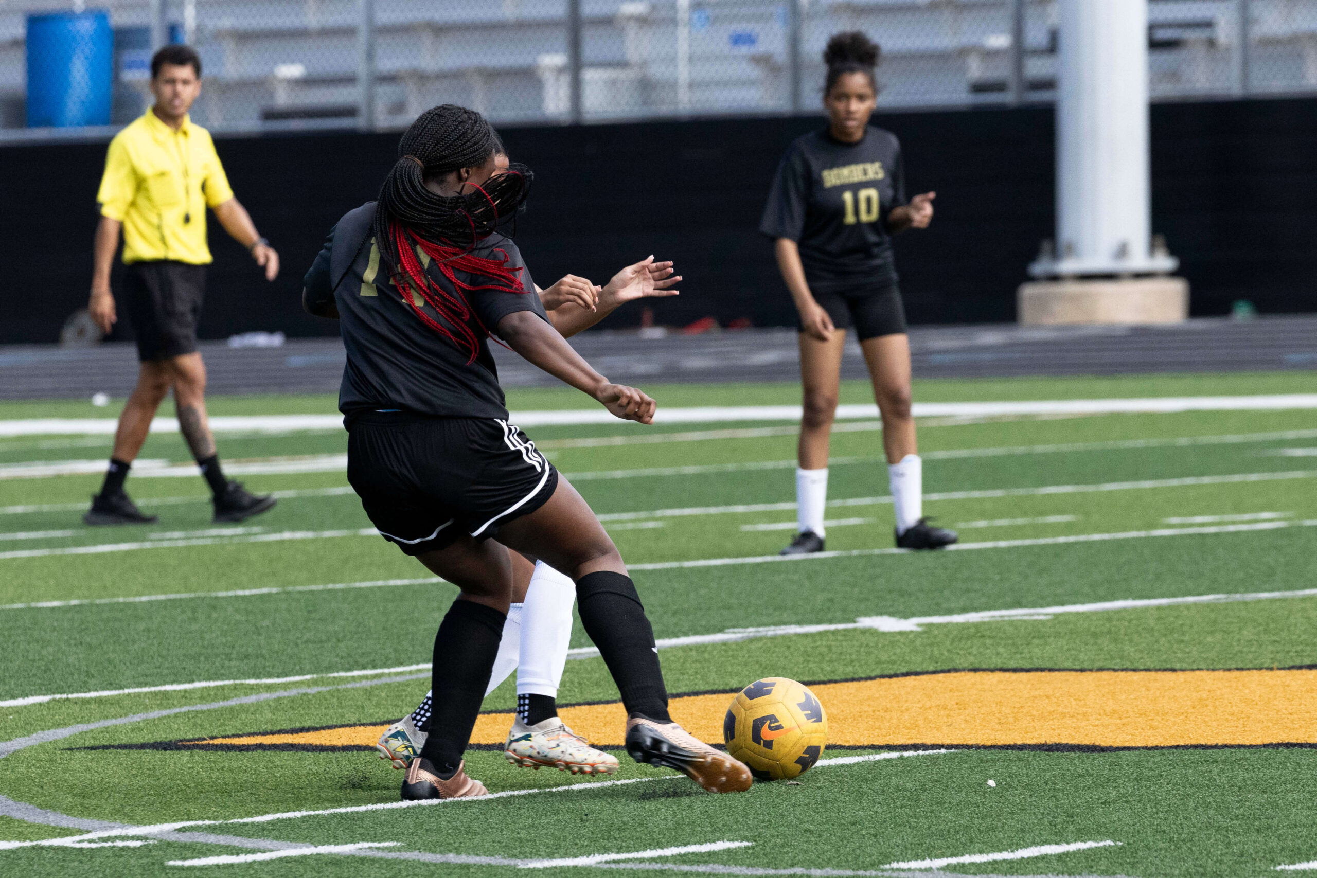 Midwest City middle school girls soccer player in black uniform dribbling the ball while being challenged by a defender