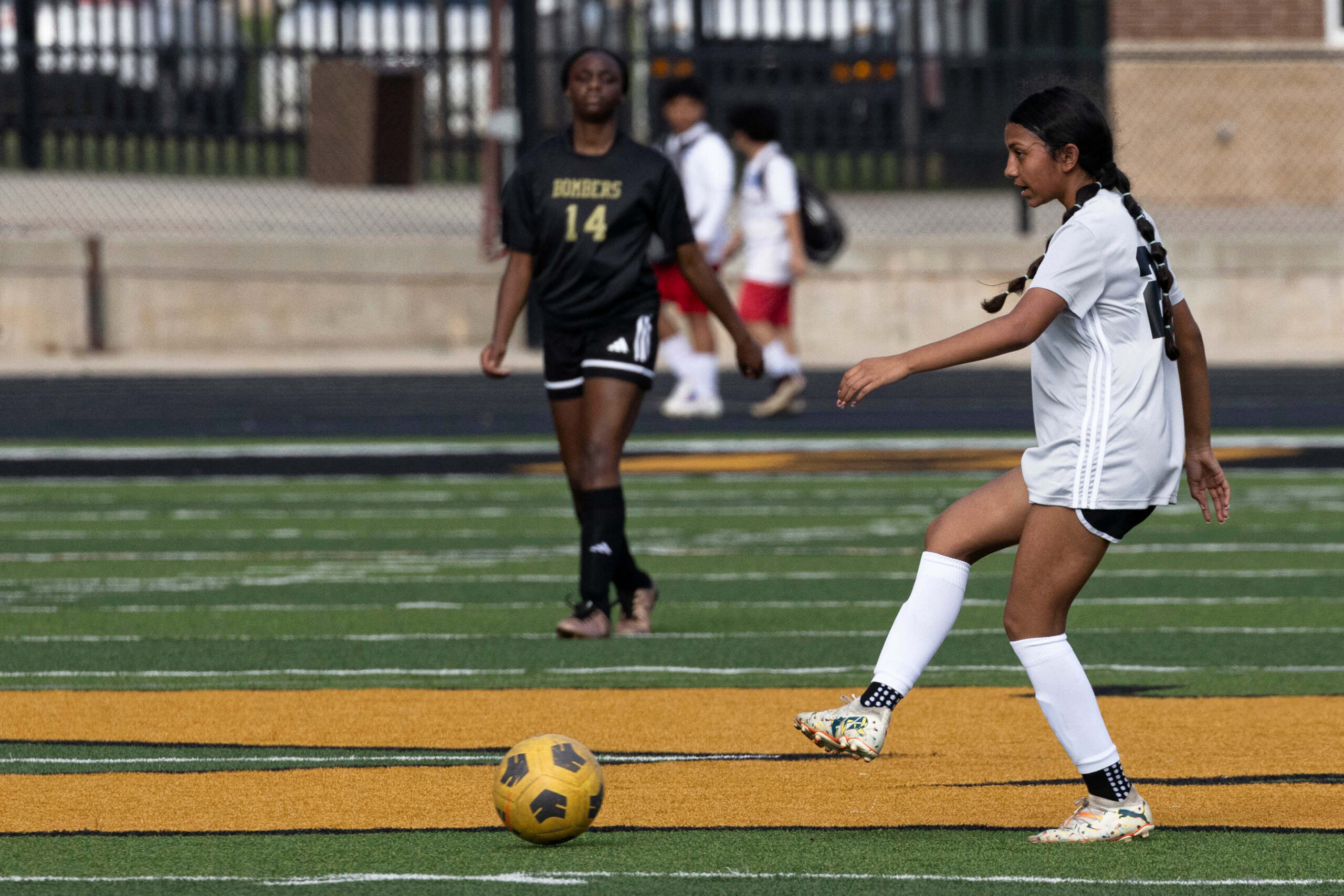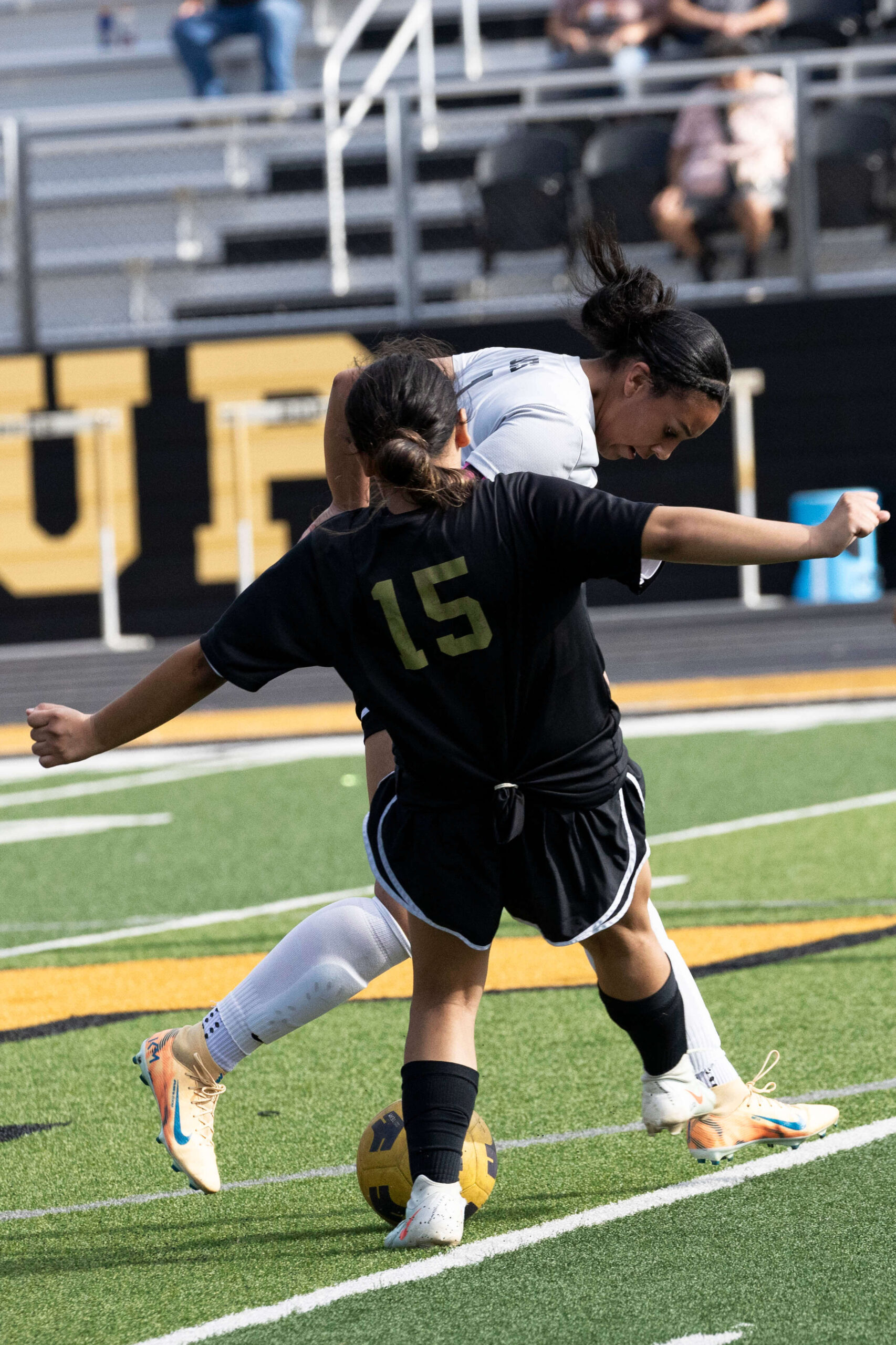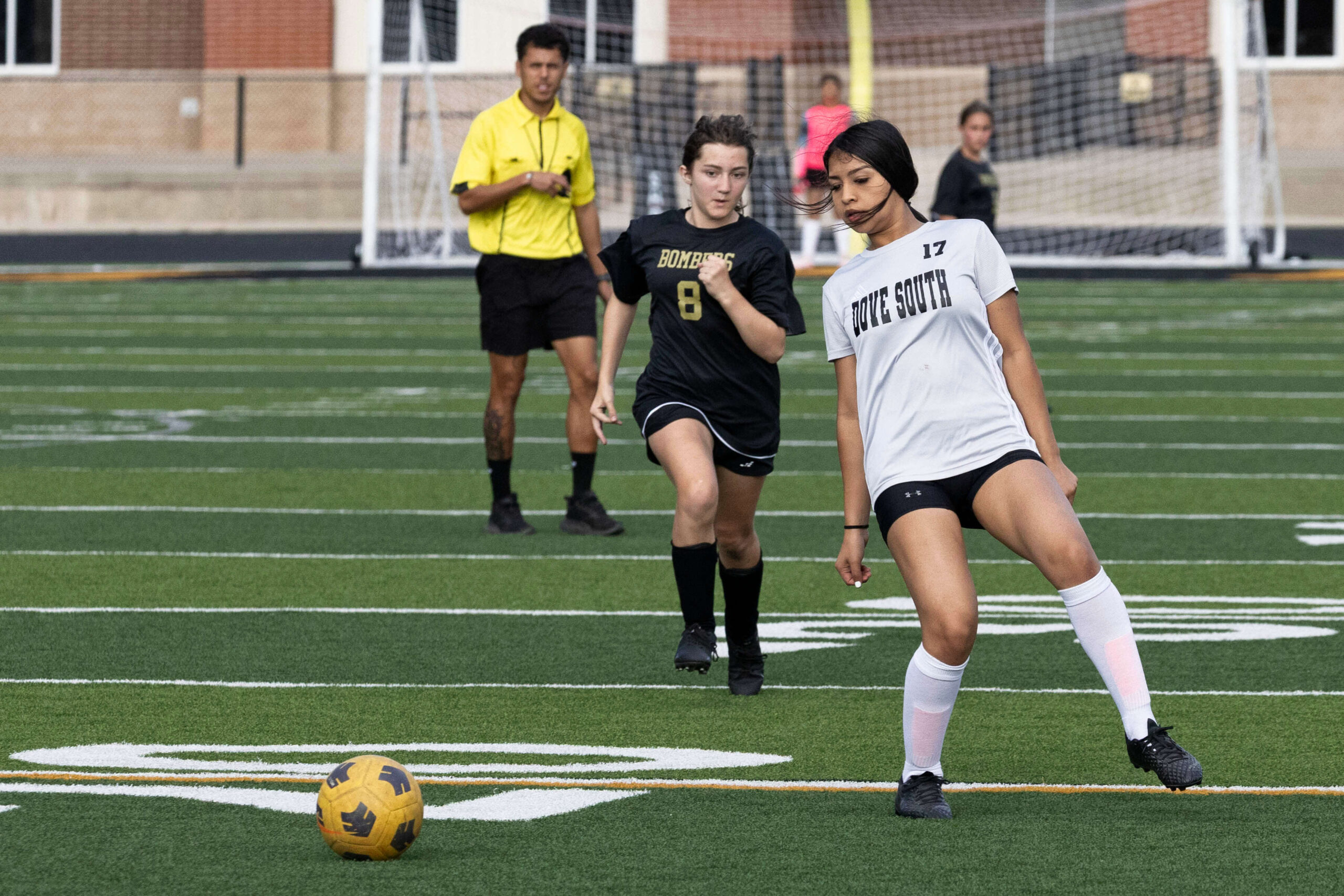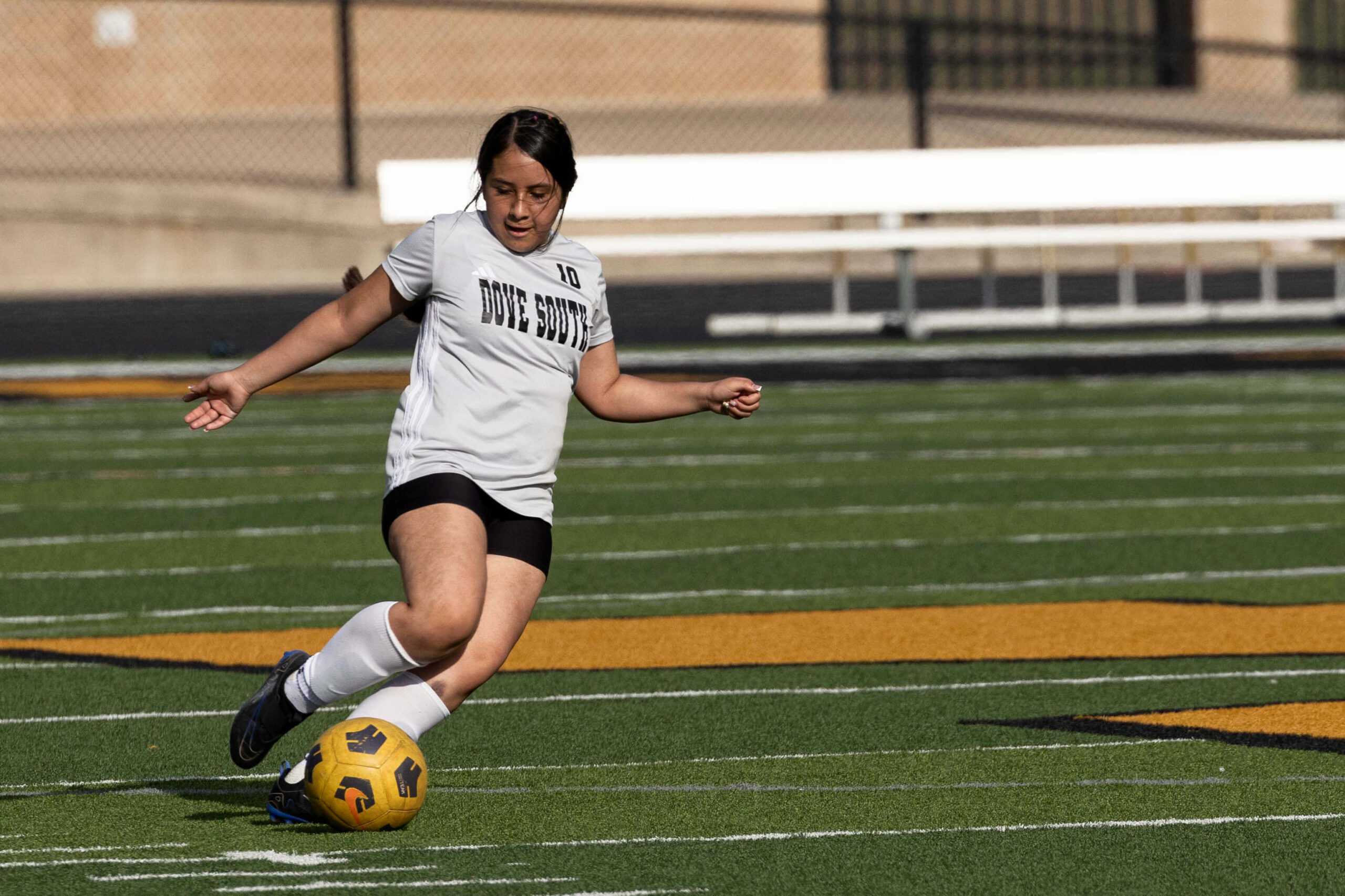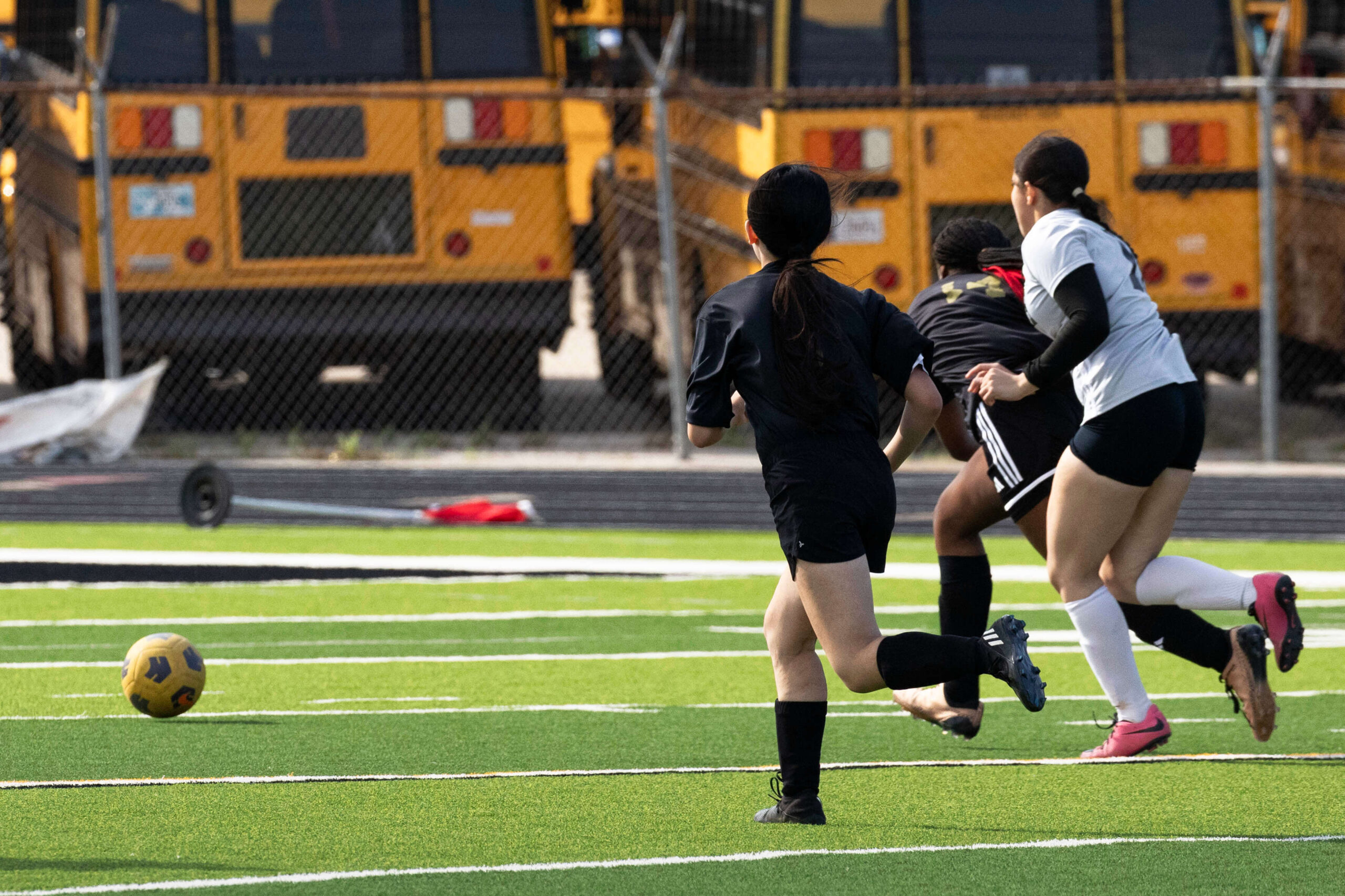 Midwest City middle school girls soccer player in black uniform dribbling the ball while being challenged by a defender