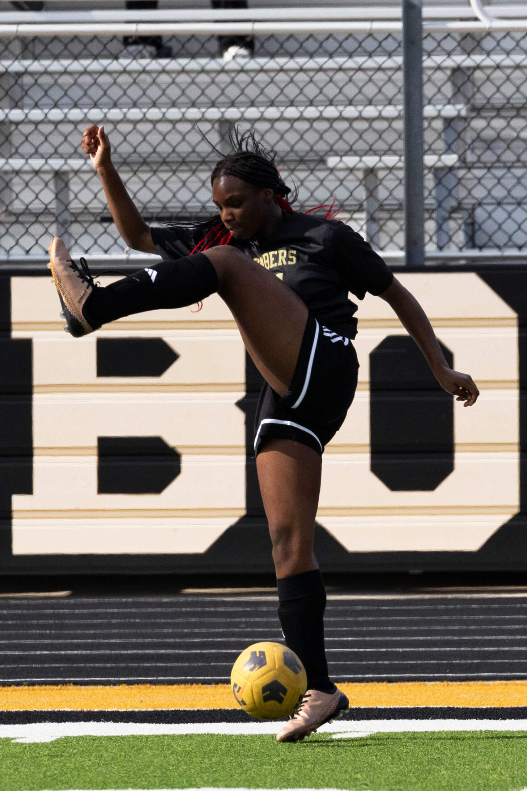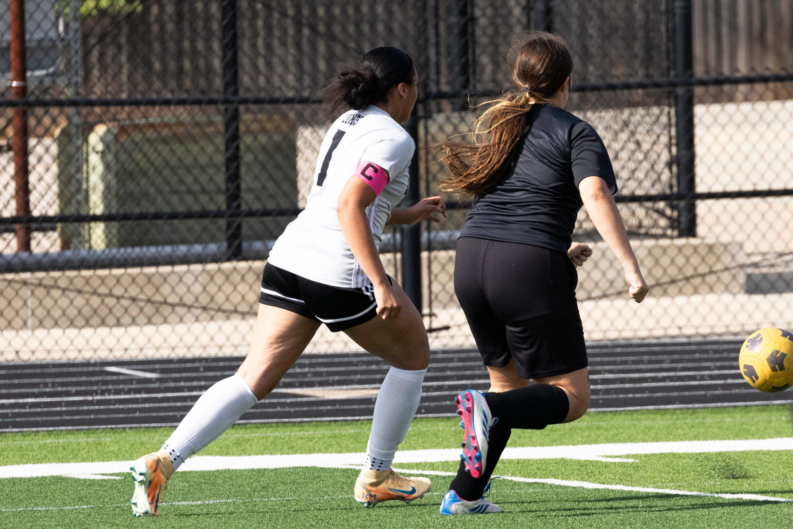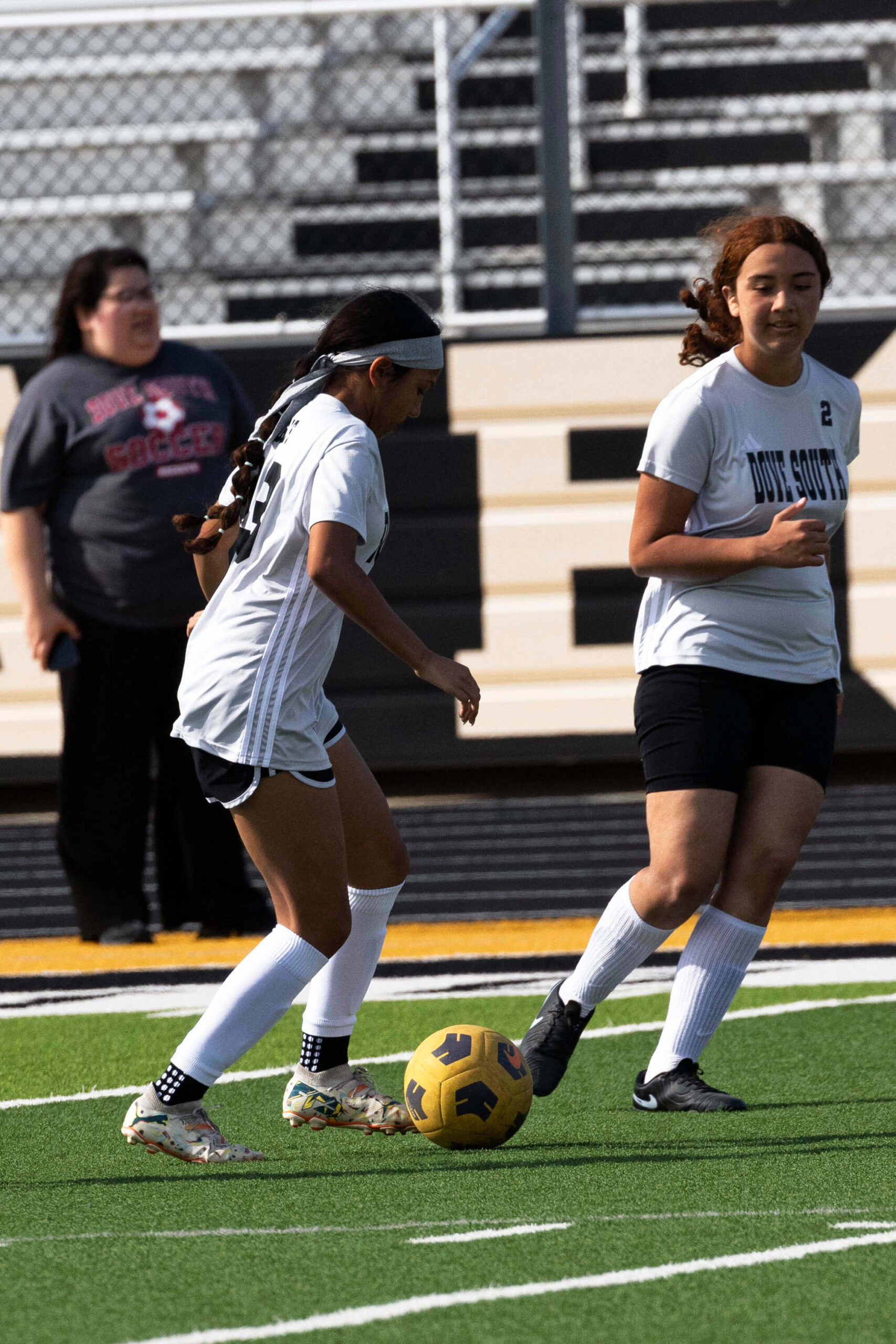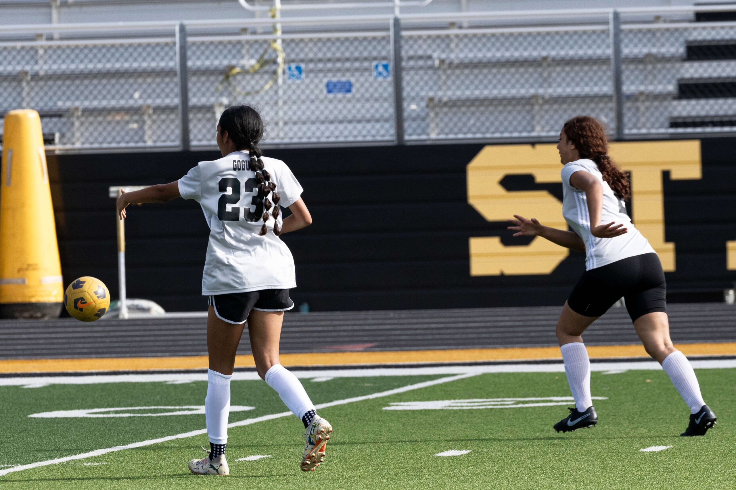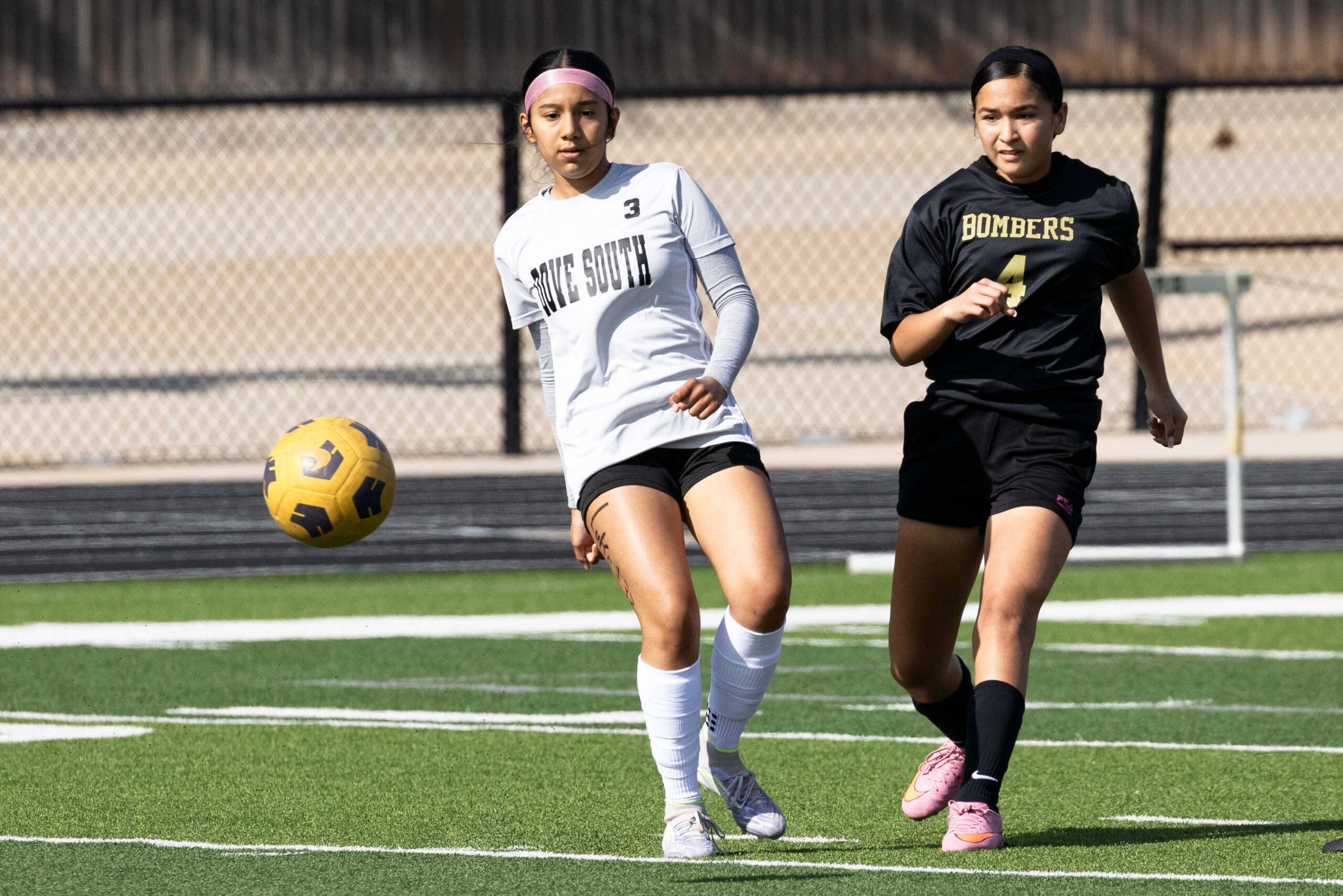 Midwest City middle school girls soccer player in black uniform dribbling the ball while being challenged by a defender