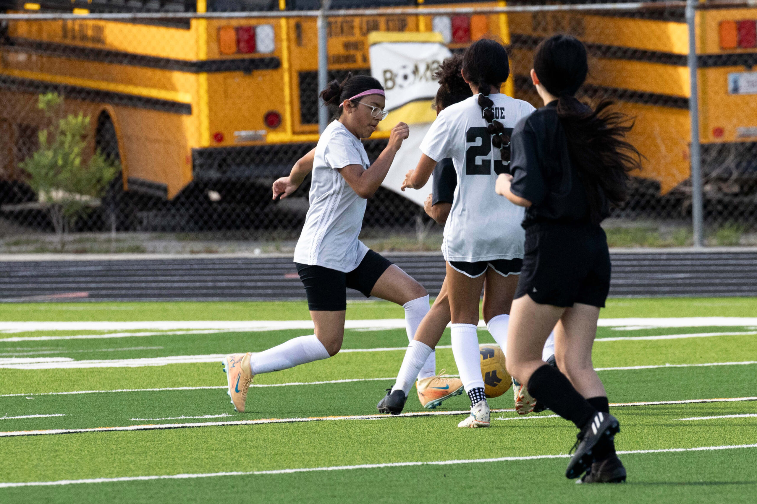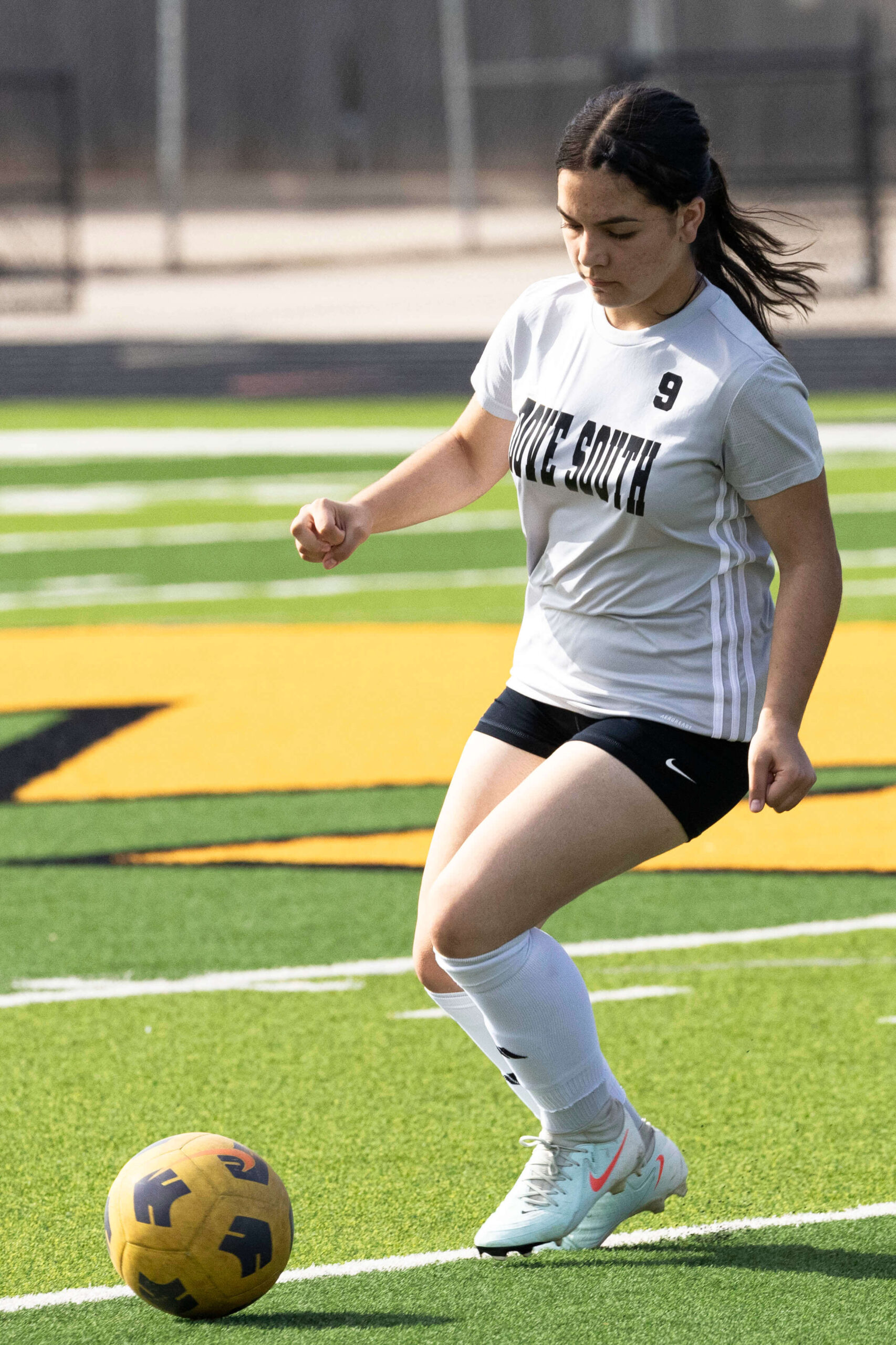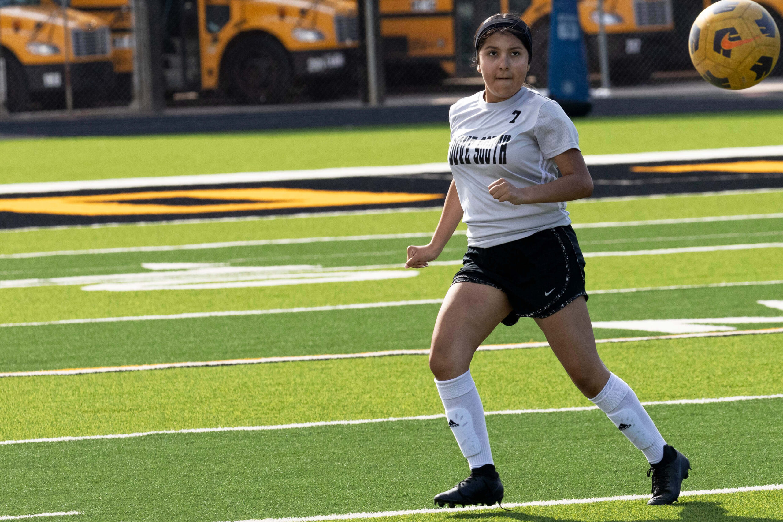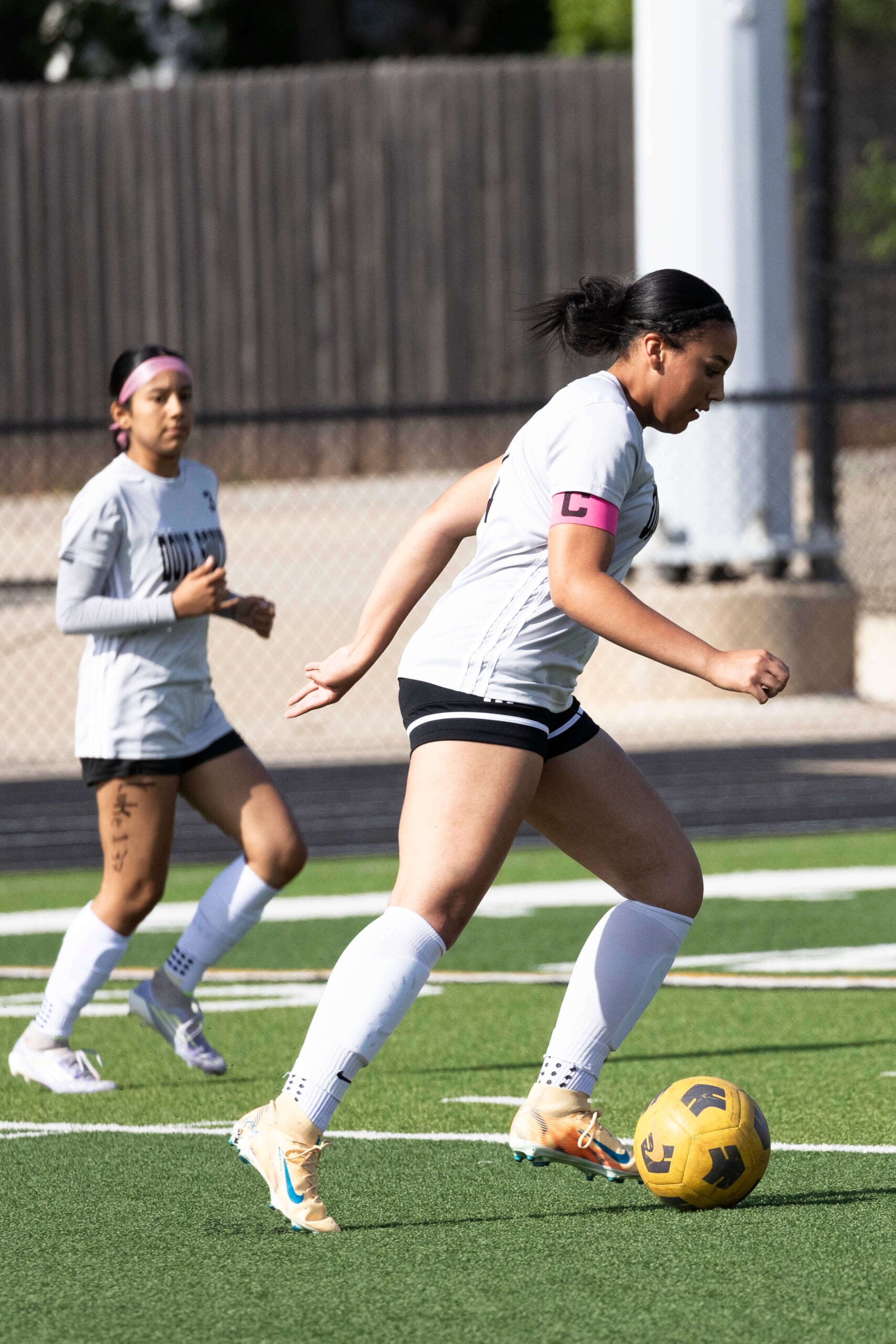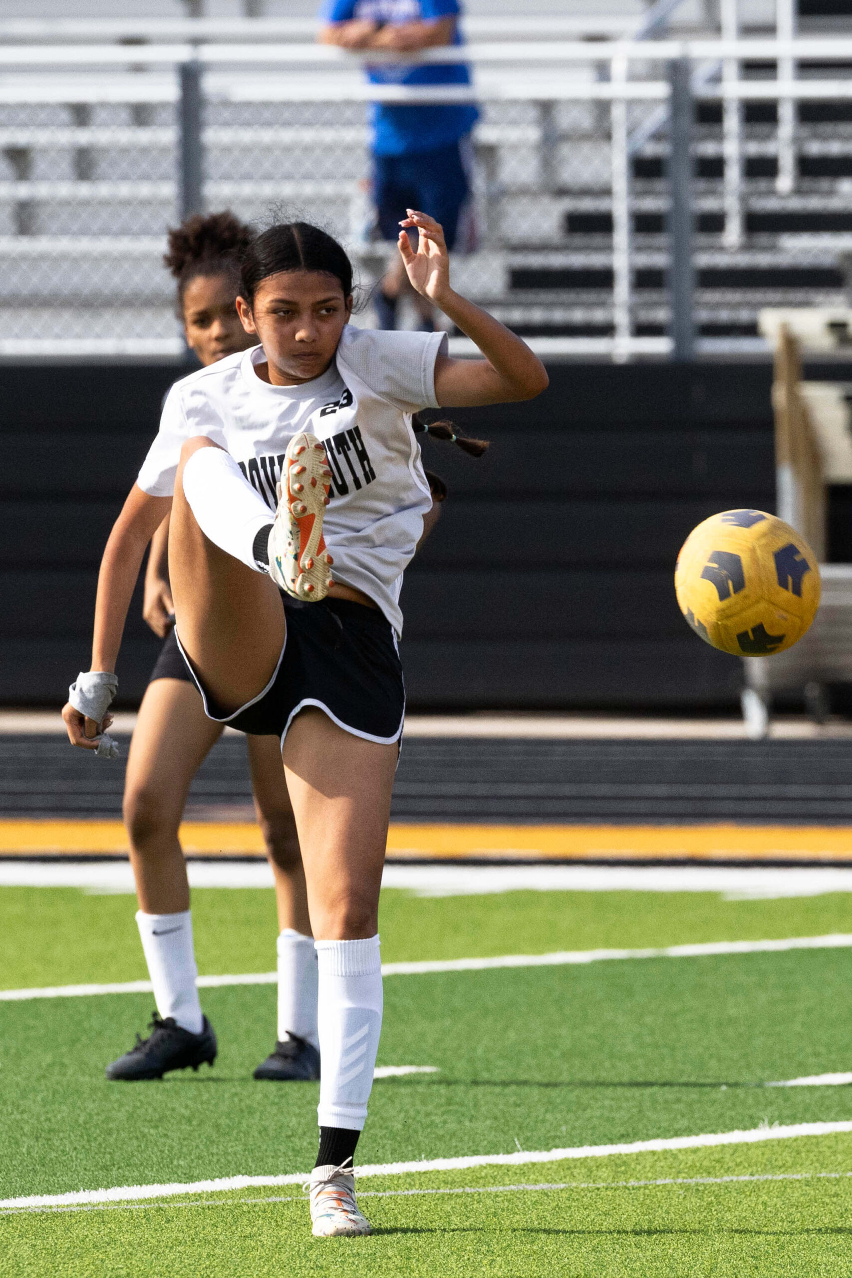 Midwest City middle school girls soccer player in black uniform dribbling the ball while being challenged by a defender