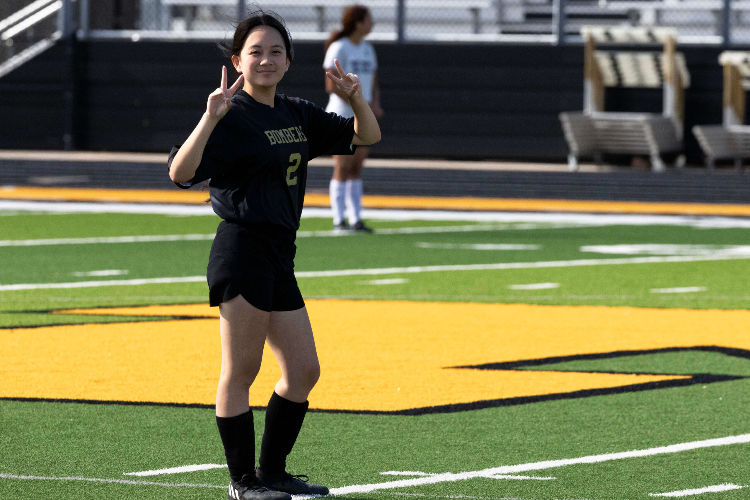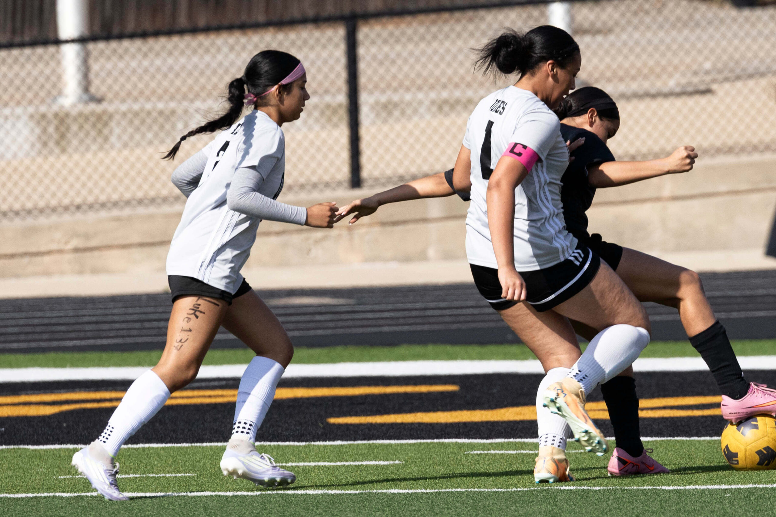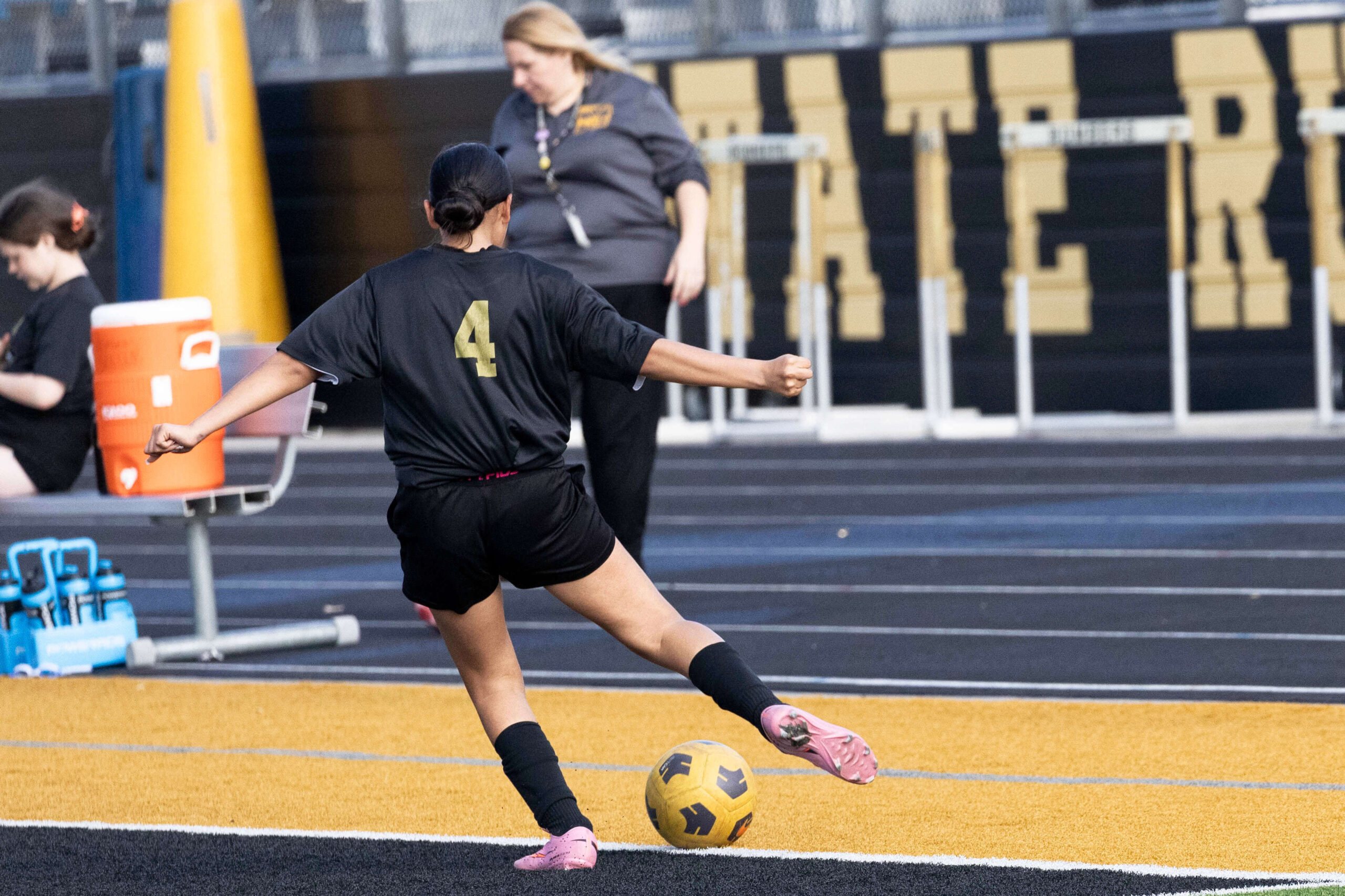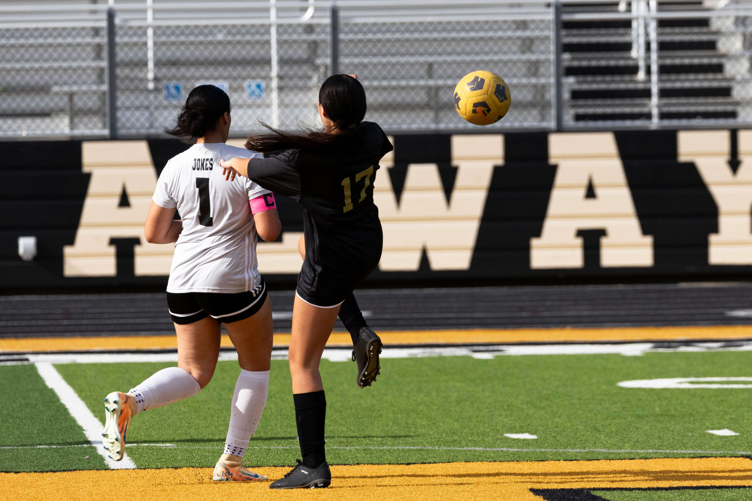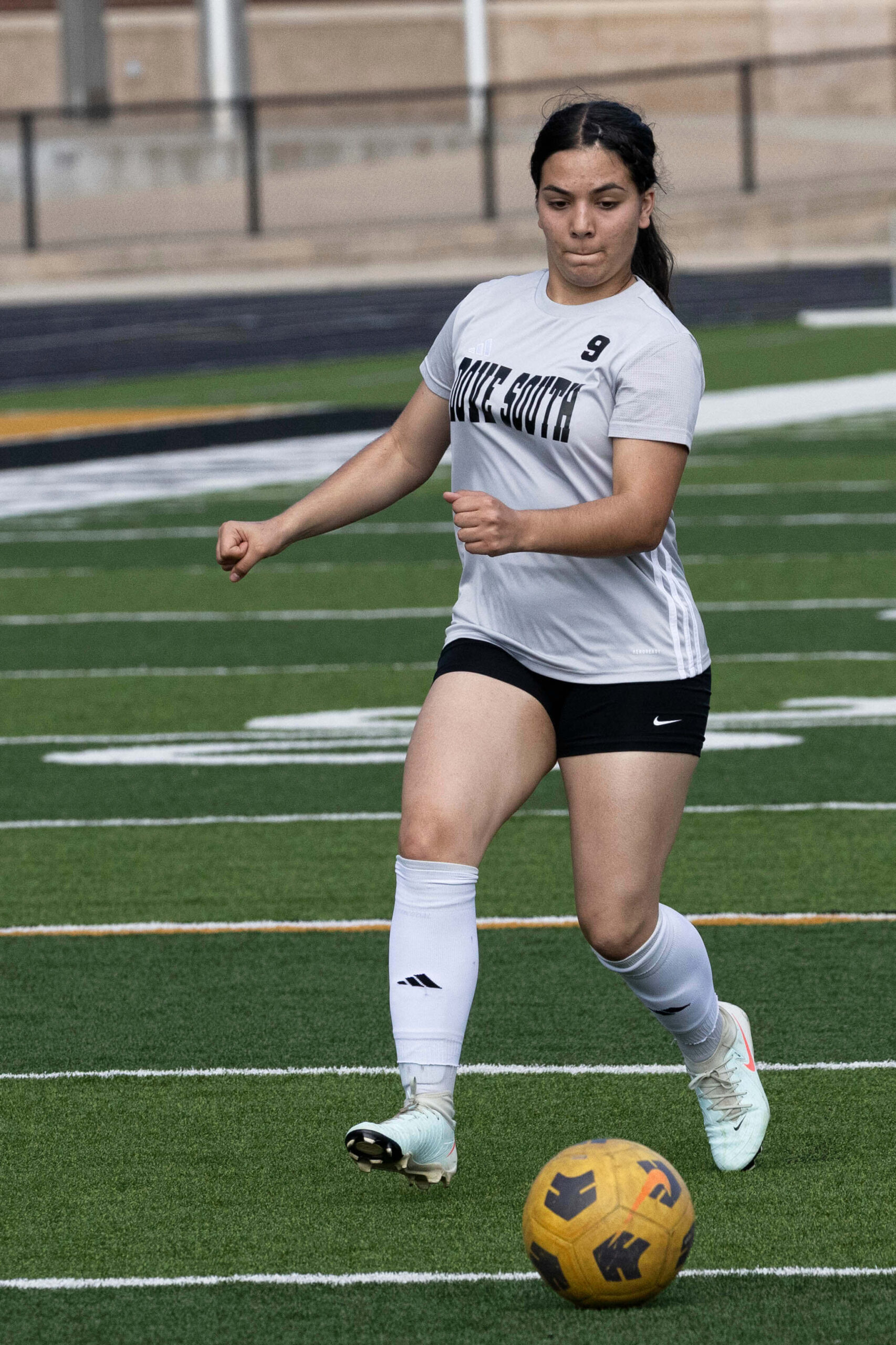 Midwest City middle school girls soccer player in black uniform dribbling the ball while being challenged by a defender